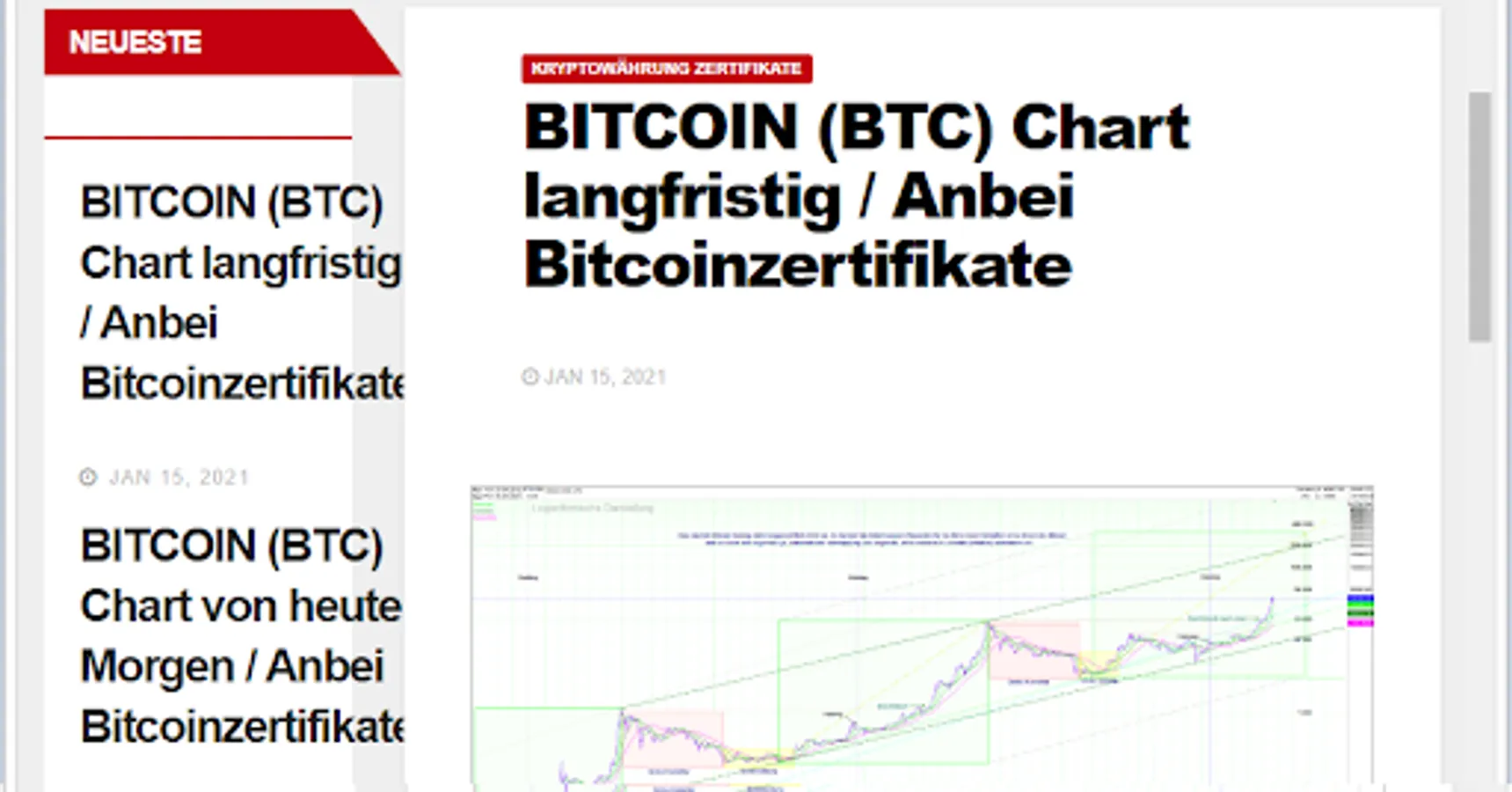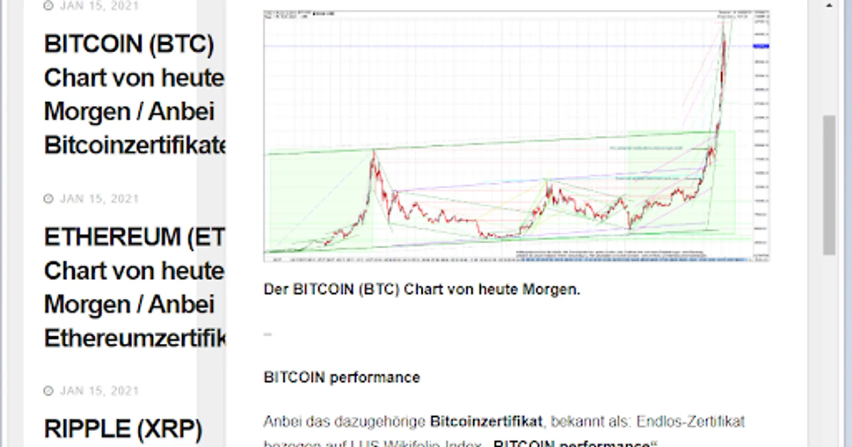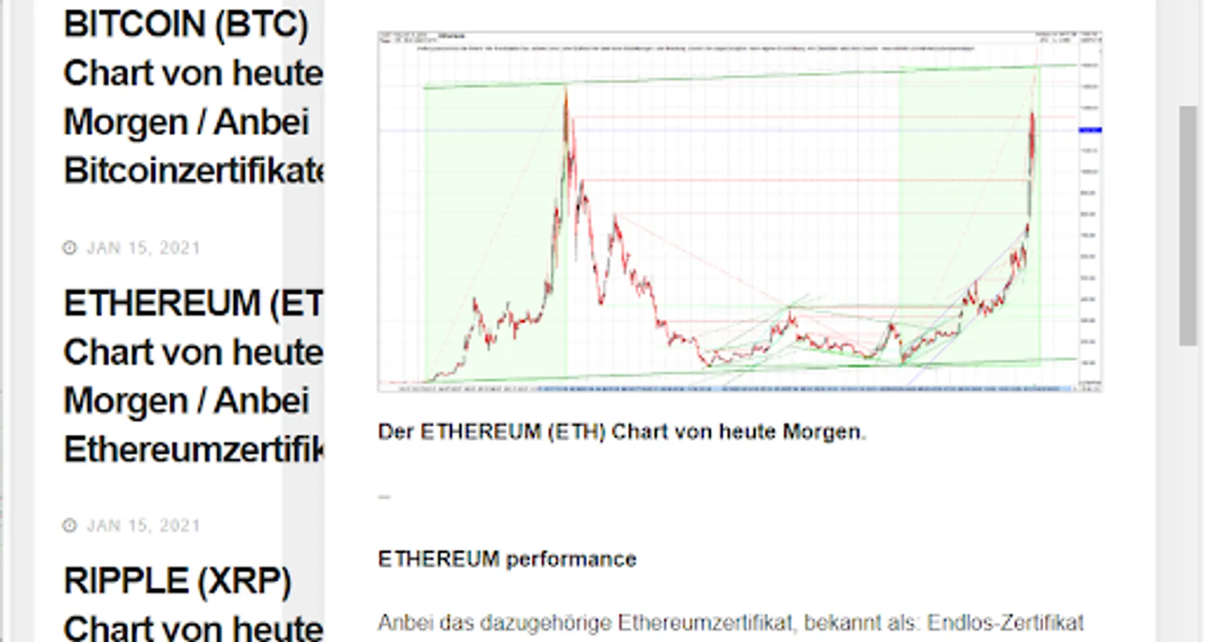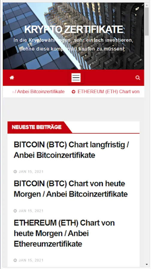 In the app KRYPTO ZERTIFIKATE, as well as on the website https://kryptowaehrung.work, articles with the current chart technology are published every day. Currently for: BITCOIN (BTC), ETHEREUM (ETH), RIPPLE (XRP), Bitcoin Cash (BCH) and GOLD.