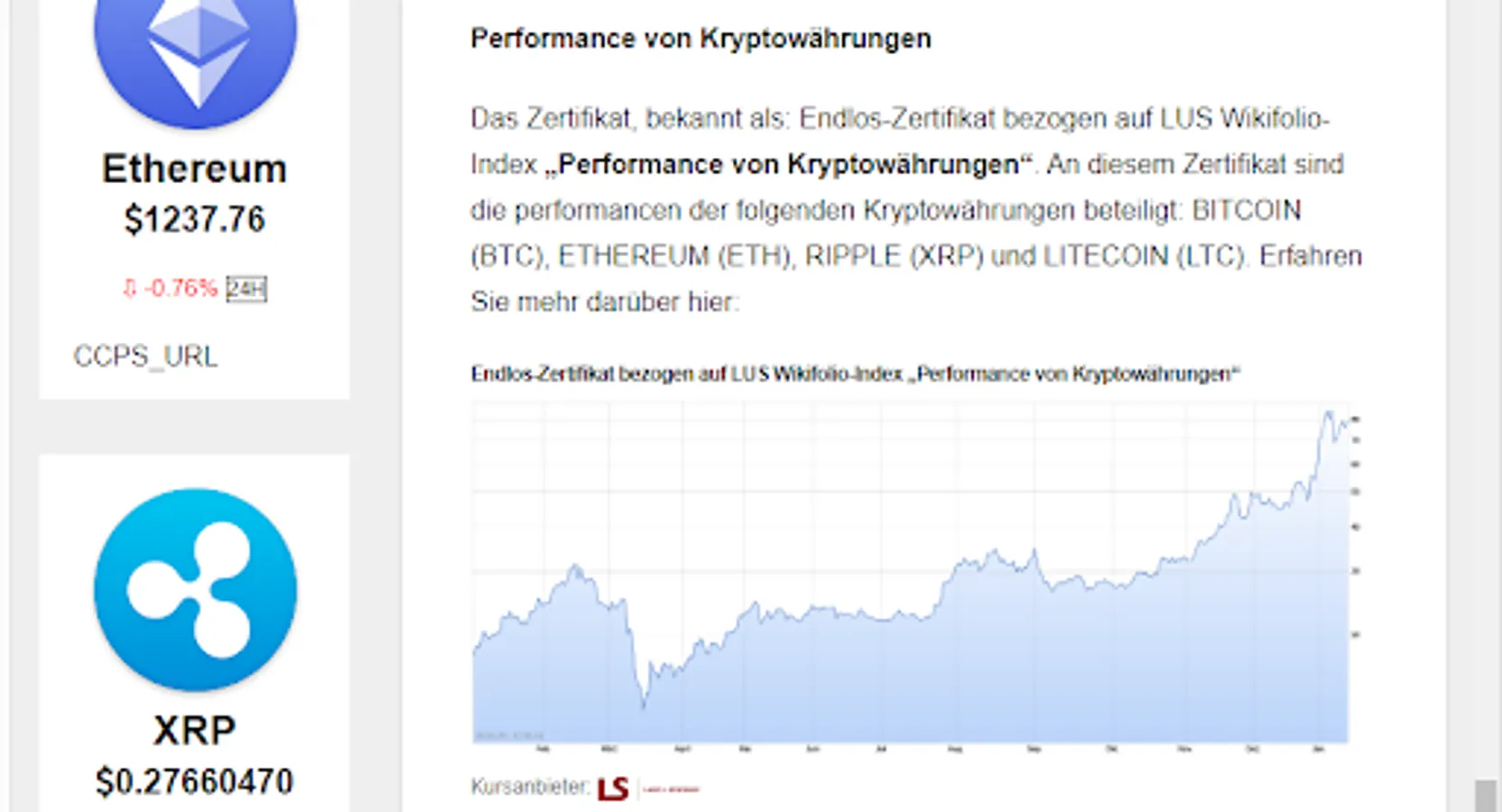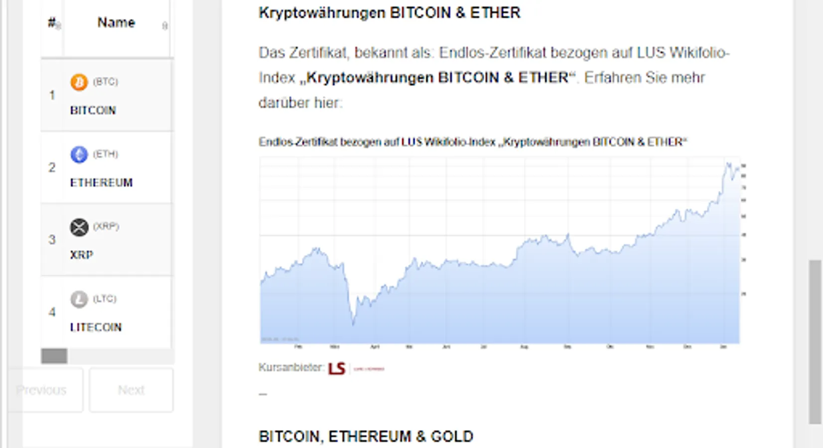 This is about the LUS wikifolio endless crypto certificates that map the performance of the most well-known and well capitalized crypto currencies, such as: BITCOIN (BTC), ETHEREUM (ETH), RIPPLE (XRP), Bitcoin Cash (BCH) and also that Precious metal GOLD. The value combinations are also available for investors, as a financial investment!