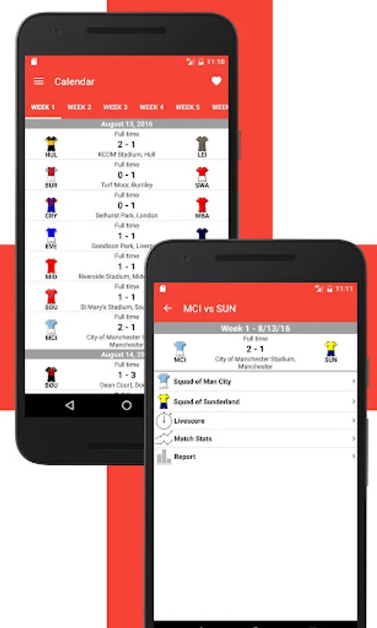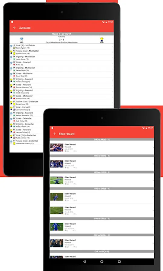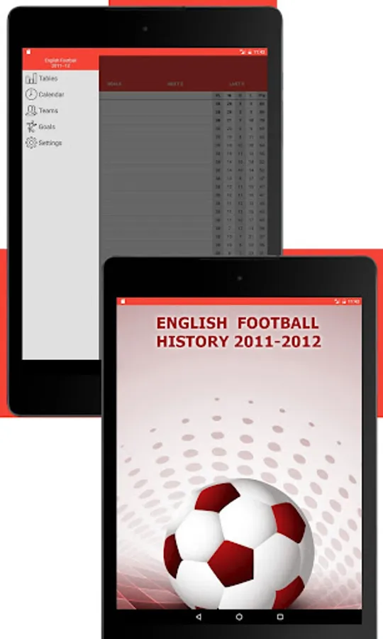 Using English Football 2011-2012 you also get immediate access to the Tournament table, Teams, Events in Matches, News and Statistics.