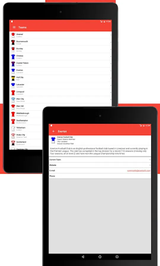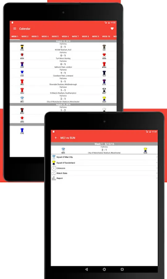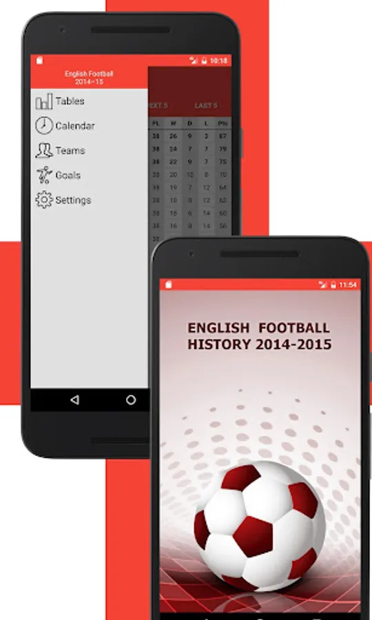 Using English Football 2014-2015 you also get immediate access to the Tournament table, Teams, Events in Matches, News and Statistics.
