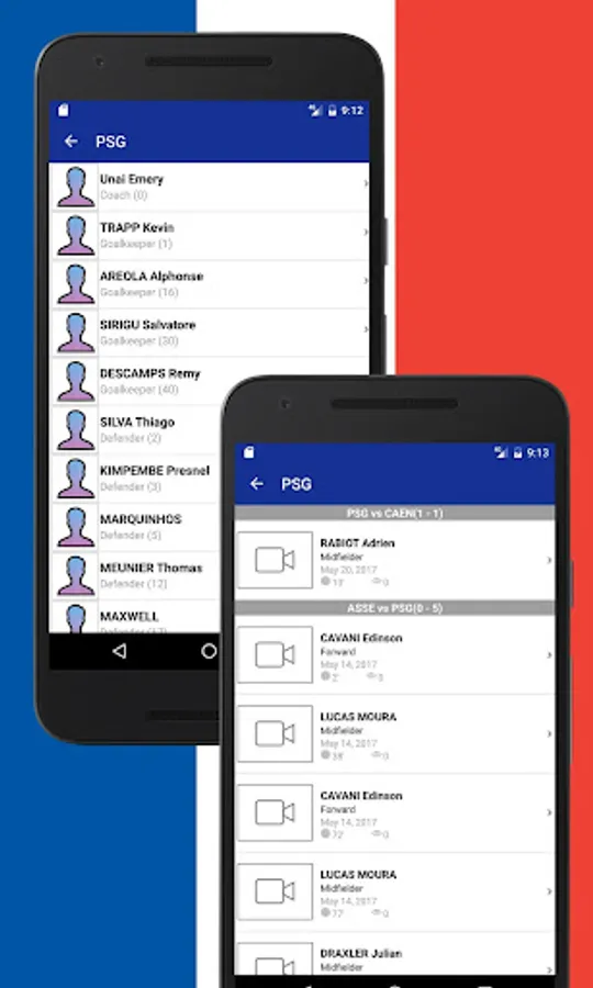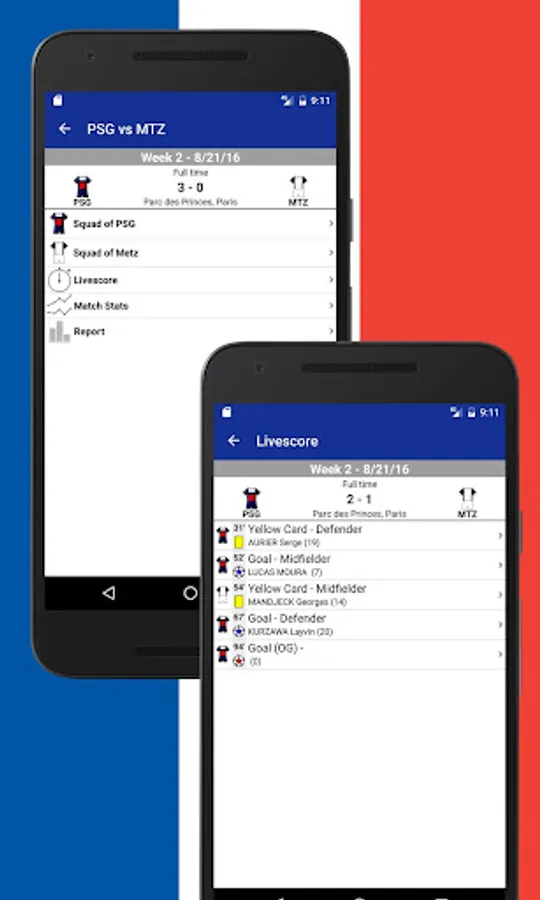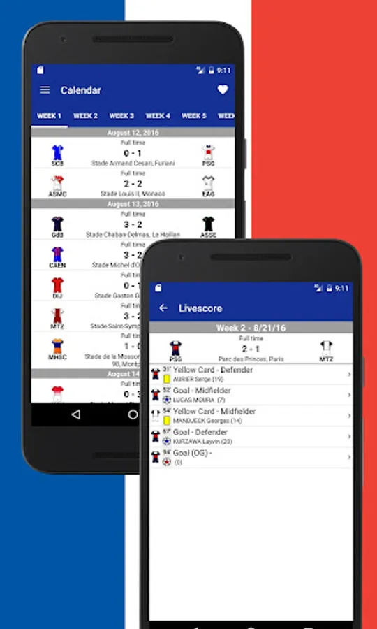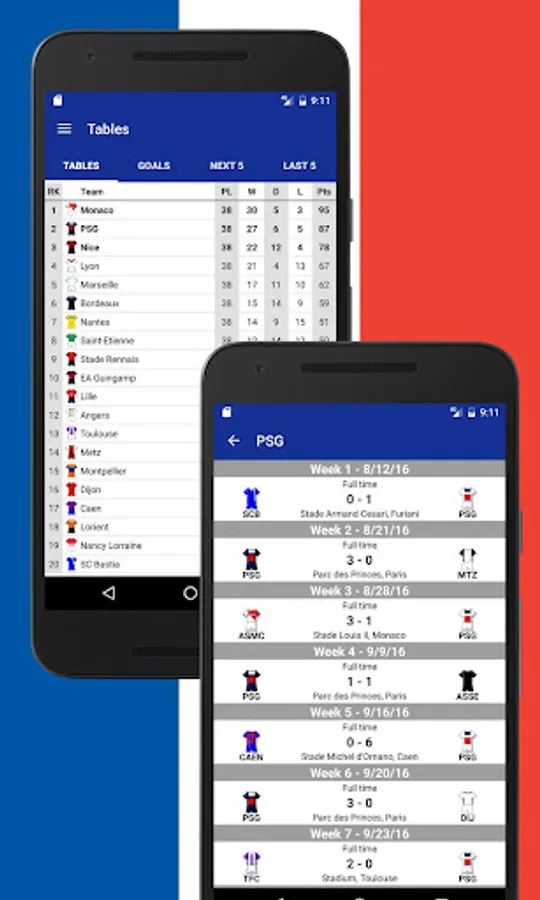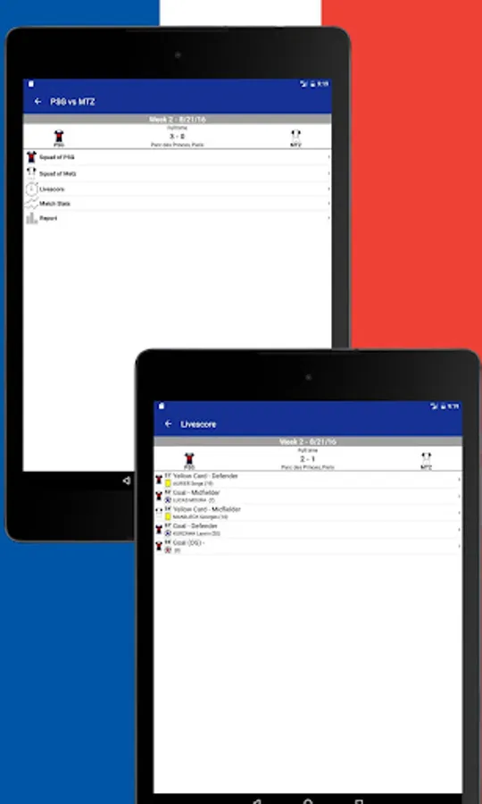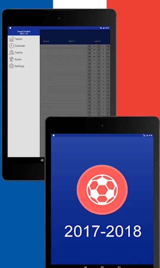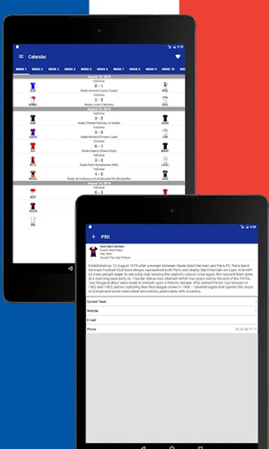 Using French Football 2017-2018 you also get immediate access to the Tournament table, Teams, Events in Matches, News and Statistics.