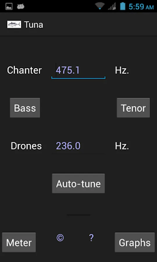 Just set the frequencies you want your chanter and drones tuned to, then use the meter screen, or the spectrum screen to set them as you play.