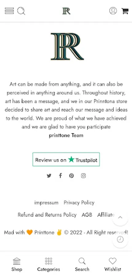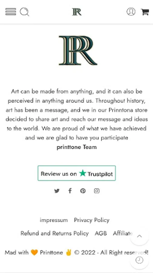 يمكن للفن أن يصنع من أي شيء ، ويمكن أيضًا إدراكه في أي شيء من حولنا. عبر التاريخ ، كان الفن رسالة ، وقررنا في متجر Prinntona الخاص بنا مشاركة الفن والوصول إلى رسالتنا وأفكارنا إلى العالم. نحن فخورون بما حققناه ويسعدنا مشاركتك