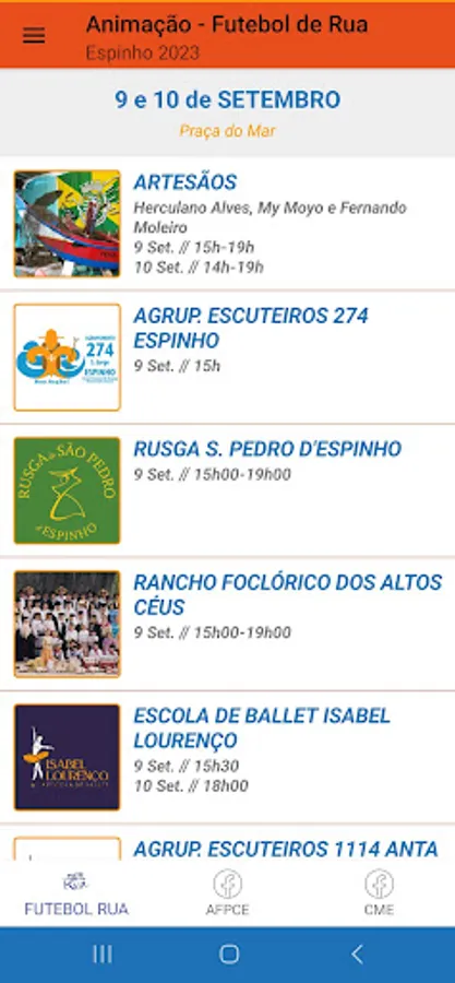 On the 9th, we will have the participation of the Escoteiros de Espinho, the Rusga de S. Pedro, the Rancho Folclórica dos Altos Céus and the Isabel Lourenço Ballet School. On the 10th, the Anta Scouts, the Espinho e Mar a Cantar Association, Rusga Nª Srª do Mar, MTV Dance Academy and Isabel Lourenço Ballet School will participate. At 3:15 pm on Sunday, we will have a special show by Lean Cruz. During the two days, we will also be able to appreciate the work of artisans: Herculano Alves, My Moyo and Fernando Moleiro.