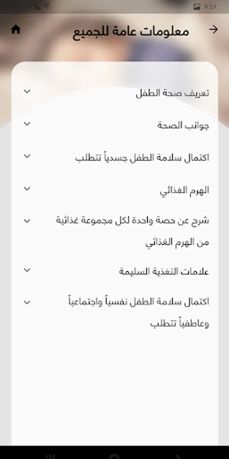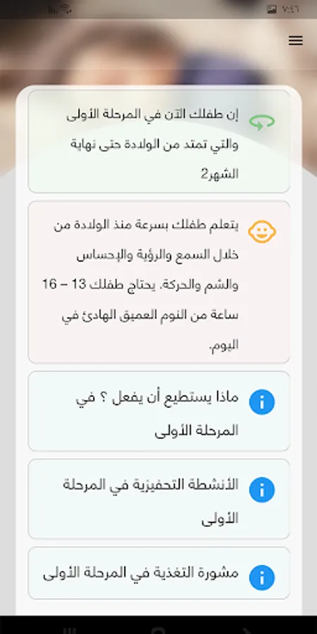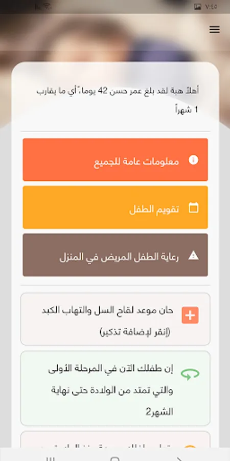 This App enables parents to follow their child's health status from birth to five years of age, divided into 15 stages. the App provides information on the status, features and skills of the child at each stage, as well as tips on appropriate nutrition and child care in case of illness. The application also provides suggestions for motivational activities that parents can do with their child as well as a reminder service for the necessary vaccines for the child.