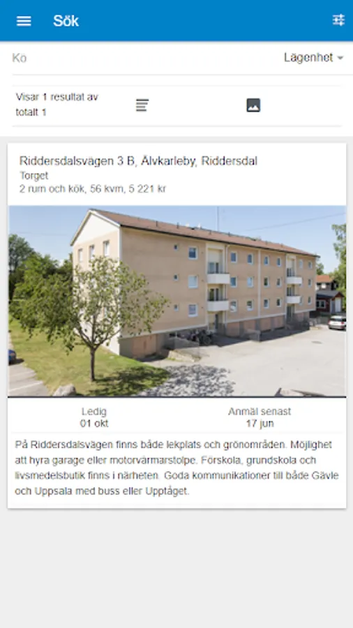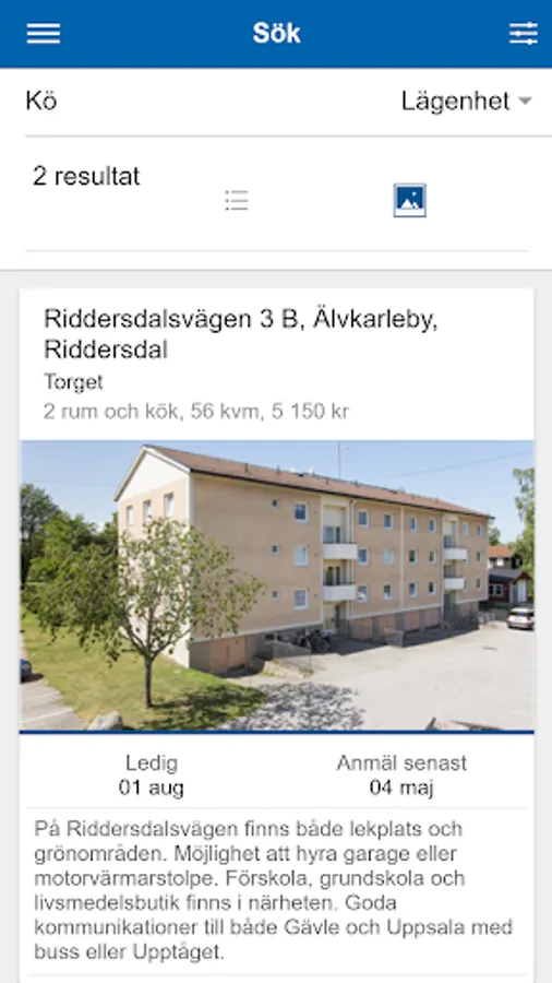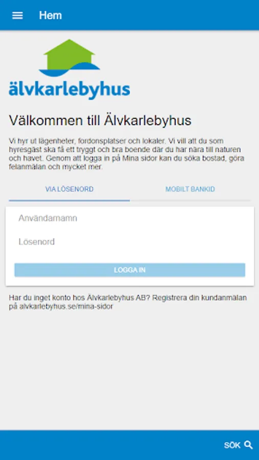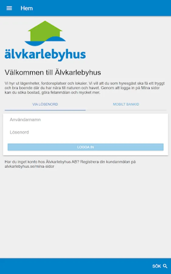 With Älvkarlebyhus bostadsapp are you looking for vacant apartments and parking spaces. In order to make interest and respond to the offers you need to be registered as candidates in Älvkarlebyhus which you do in the app or on our website. It's the same credentials in the app "My pages". If you are a tenant can log in and make your complaint around the clock, see your rent notices, receive news and malfunctions related to your accommodation directly on your phone.