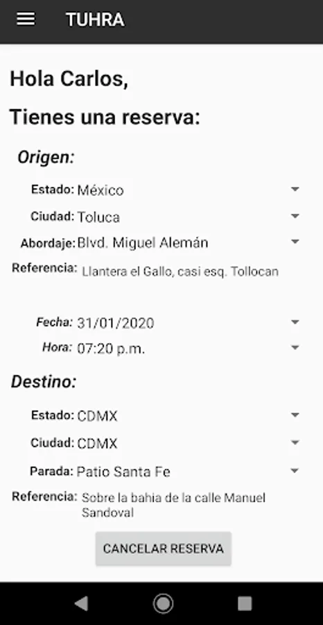 Initially we have routes from the city of Toluca to Santa Fe and from Santa Fe to Toluca. Through the application you can book at no cost. The reservation does not guarantee that access to the transport units will be allowed.