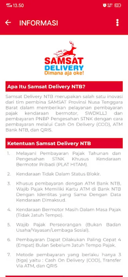 Samsat Delivery NTB is one of the innovations of the SAMSAT team of West Nusa Tenggara Province in providing motor vehicle tax payment services, SWDKLLJ and PNBP payments. Validation of STNK by means of payment via Cash On Delivery (COD), Bank NTB ATM (ESAMSAT), and QRIS which designed and built for PKB and SWDKLLJ payment services as well as online, electronic and independent Tax Information (PKB) Information services for Motor Vehicles, hereinafter referred to as the NTB Samsat Delivery application product brand, which is managed and developed by the NTB REGIONAL INCOME MANAGEMENT AGENCY (BAPPENDA). NTB PROVINCE) which is domiciled in the city of Mataram, NTB.