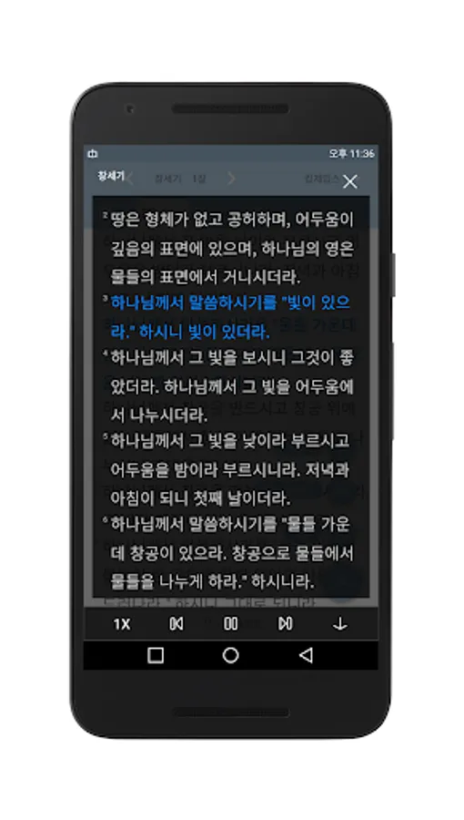 3. TTS 기능으로 성경을 음성으로 들을 수도 있습니다. 물론 속도 조절도 가능합니다.