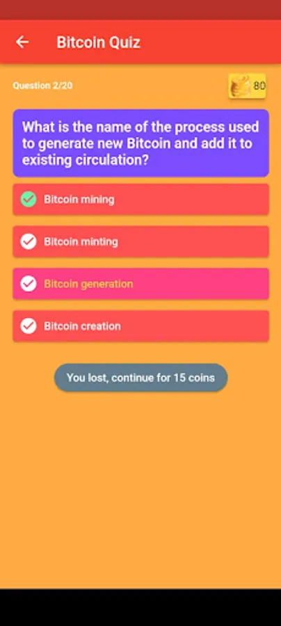 What makes Bitcoin Quiz special? In addition to its extensive bank of questions, the application allows you to play and learn simultaneously. Each correct question rewards you with virtual coins, allowing you to continue playing if you lose.