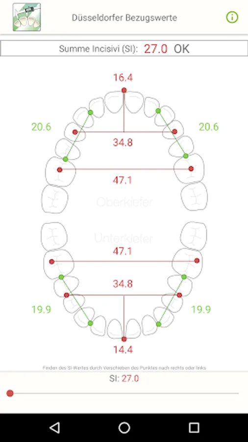 A planning tool for assessing the arch form. Measure the width of the four incisors in the upper jaw and adds the four incisor widths (SI sum incisors). Then you look for this calculated value is displayed above the slider. At the same time you can read the most important associated reference values for the arch form.