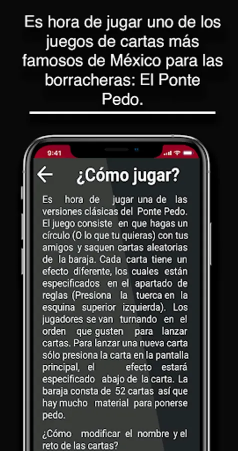 In this paid version of "Ponte Pedo" you can modify the rules to your liking so that there are no limits on your binge drinking. The Ponte Pedo is a very famous game in Mexican drunkenness. Have fun playing with the 52 cards (not counting the joker) that a traditional deck has. Don't worry about losing or getting your cards wet, buy this App and let the drunkenness begin!