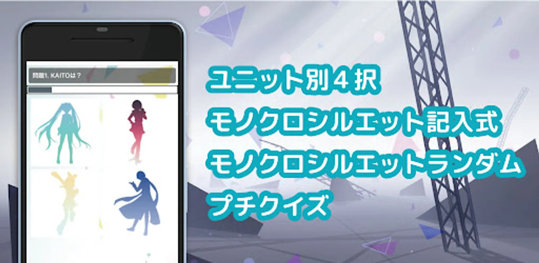スマホゲームプロジェクト「プロジェクトセカイ カラフルステージ! feat. 初音ミク」の人気キャラクター達をシルエットで当てるクイズです。