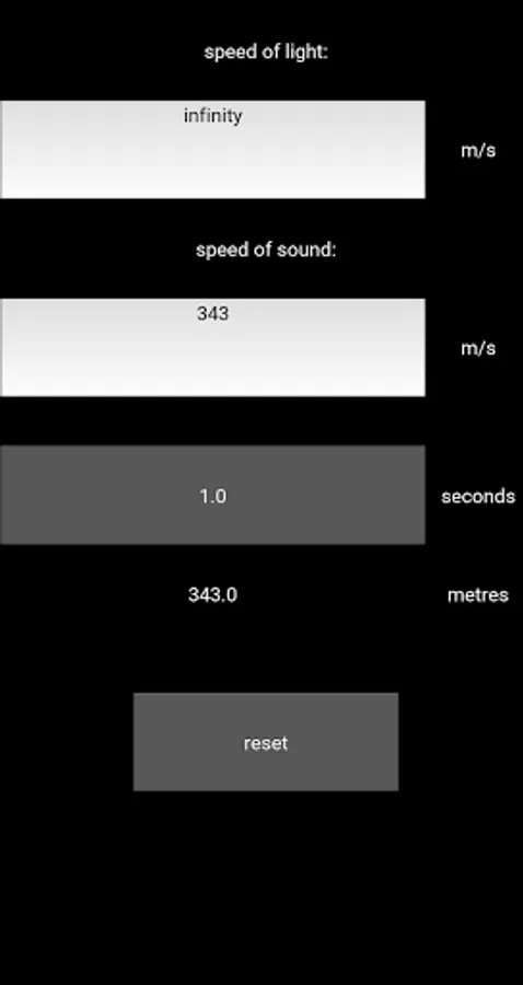 This app is a stopwatch + calculator. You input two speeds (1.lightspeed & 2.soundspeed by default) and then you can start the stopwatch. Under the stopwatch there will be a number that multiplies the time by ( 1 / ((1/speed2)-(1/speed1)) ) in real-time. This calculation allows you to find out how far away fireworks are by timing the difference between seeing the light of the firework and then hearing the sound.
