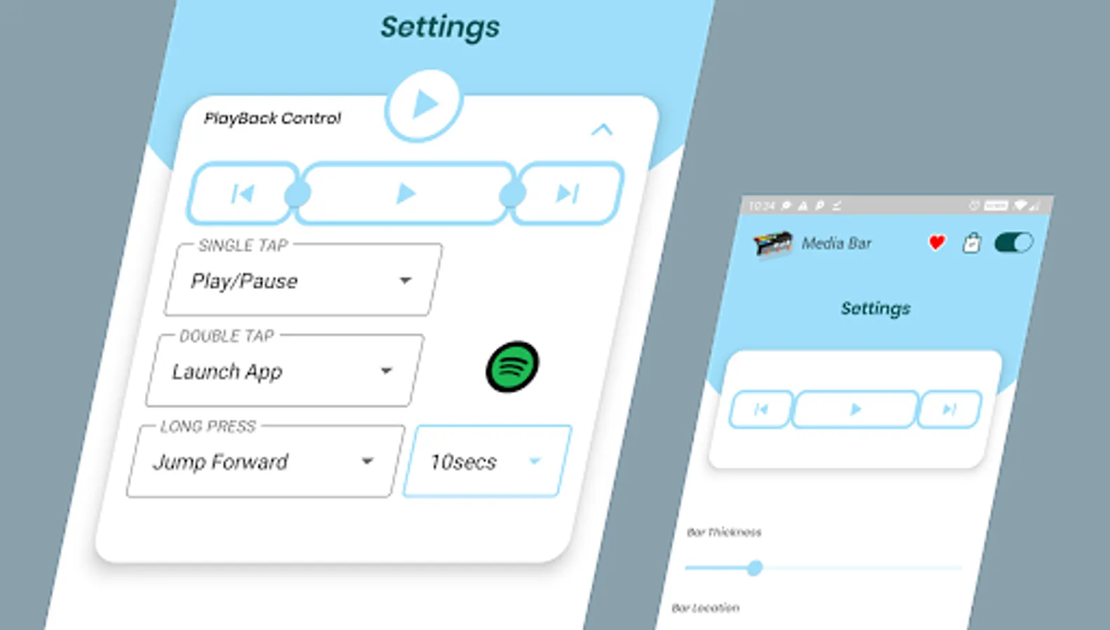Media Bar also has 3 invisible buttons that can be assigned to perform specific actions upon single tap, double tap and long press. The buttons touch regions can be customized as well.