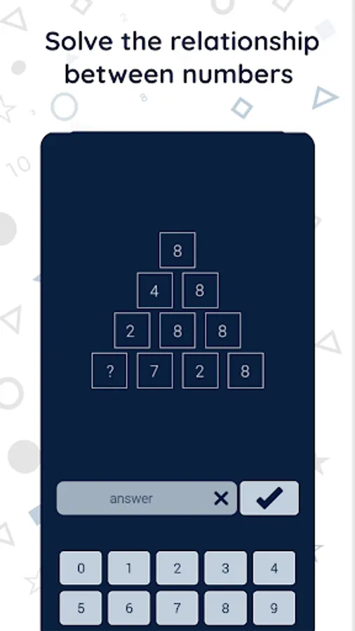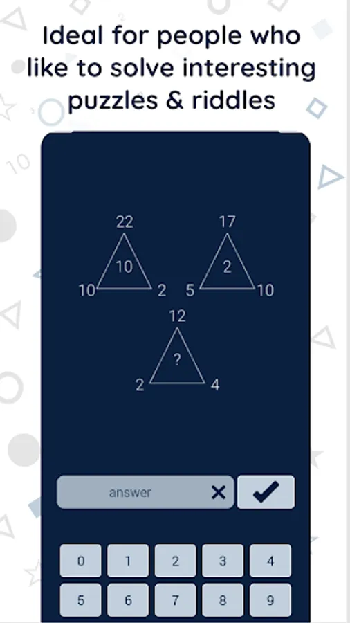 This riddle puzzle games app help you practice different mental skills: memory, attention, speed, reaction, concentration, logic, arithmetic practice, challenging strategy, mathematics with our puzzles math riddles.
