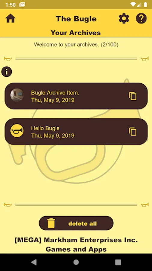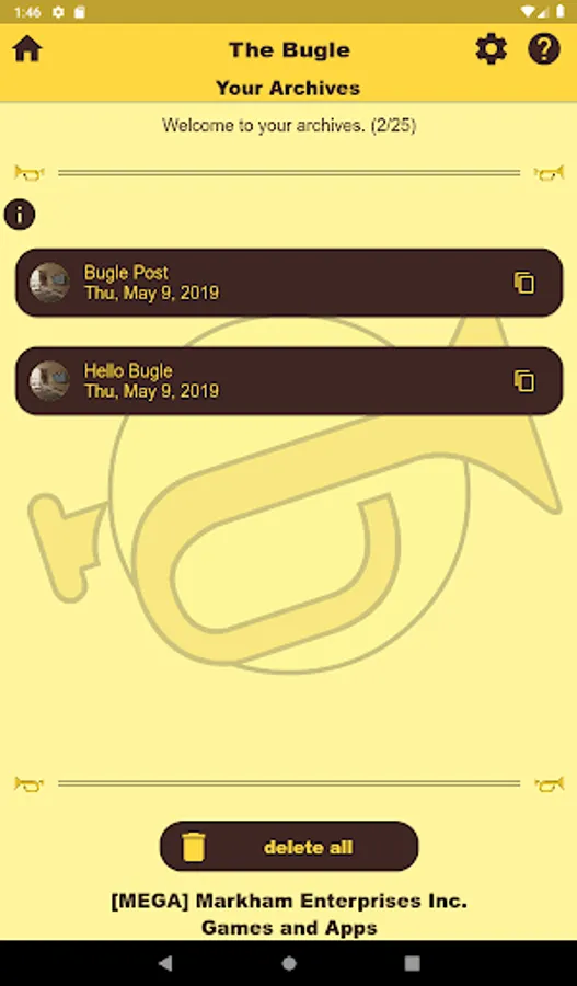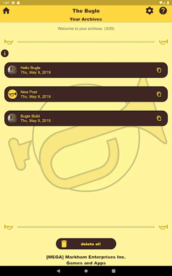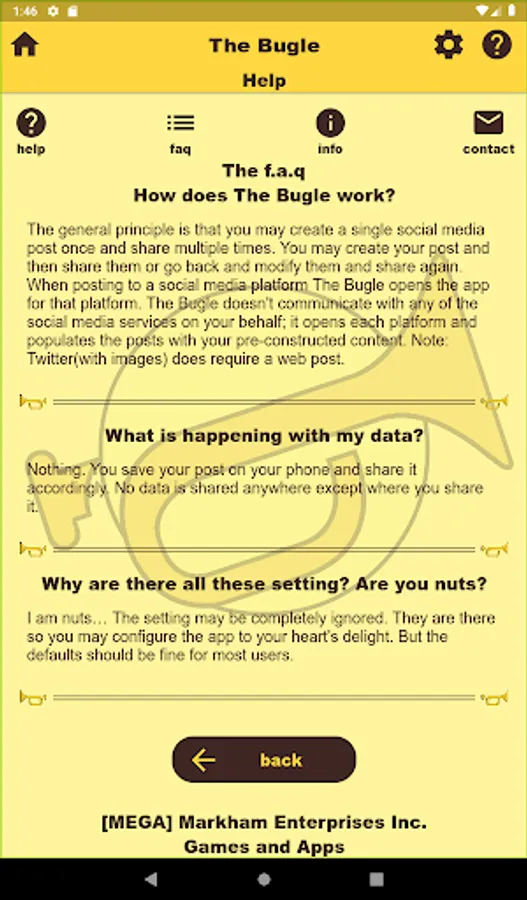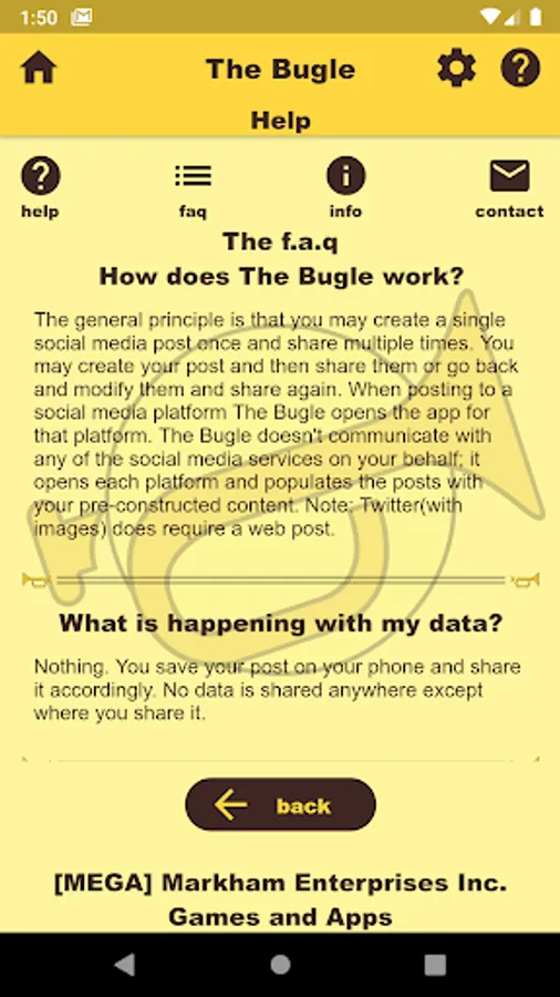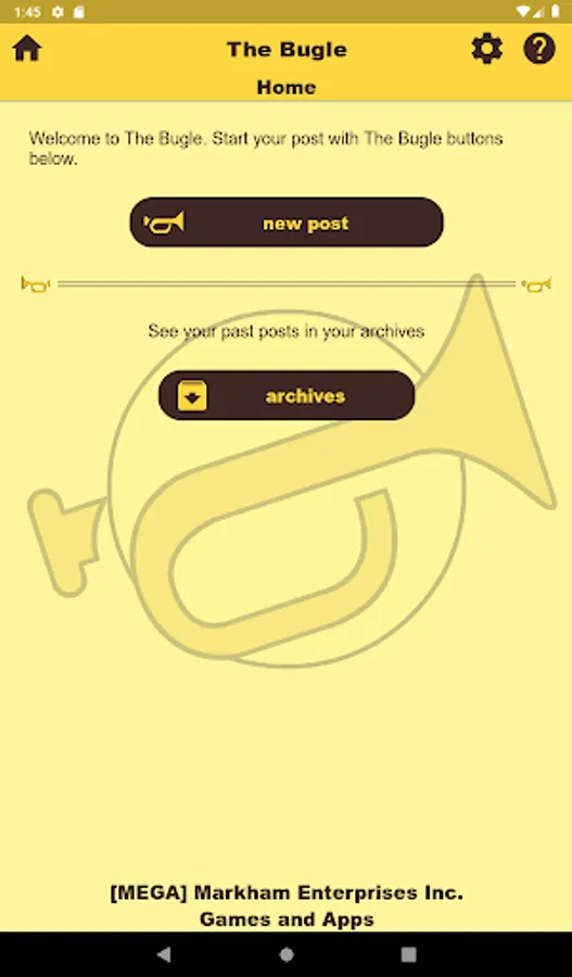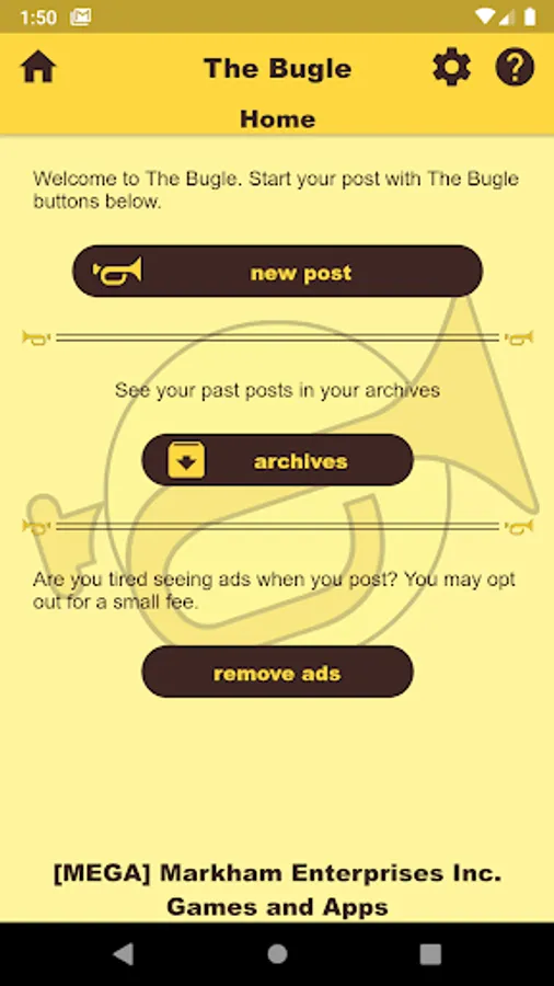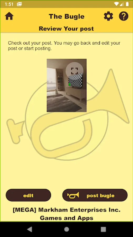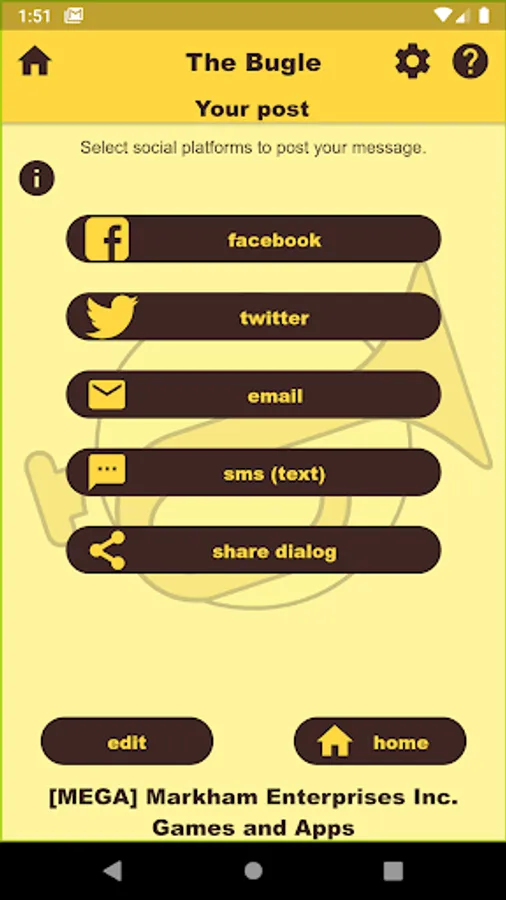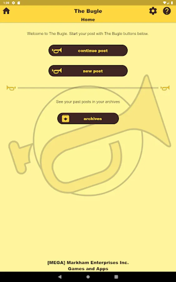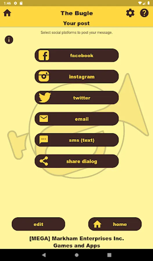 The Bugle App posts and archives your announcements and media to multiple social media platforms from one interface. In The Bugle App, users construct a multimedia post that they may transmit to multiple platforms including Twitter, Facebook, and Instagram. The users may also send these Bugle Posts via email and SMS Text.