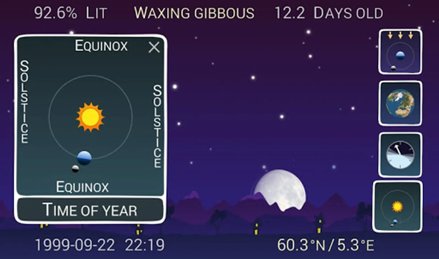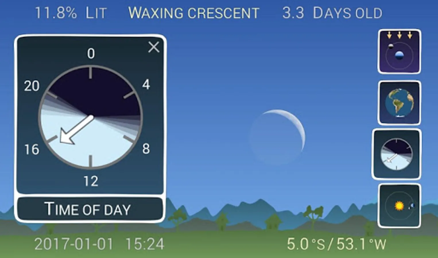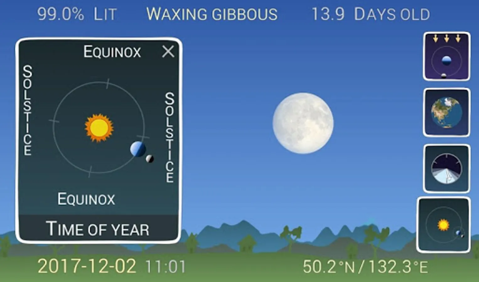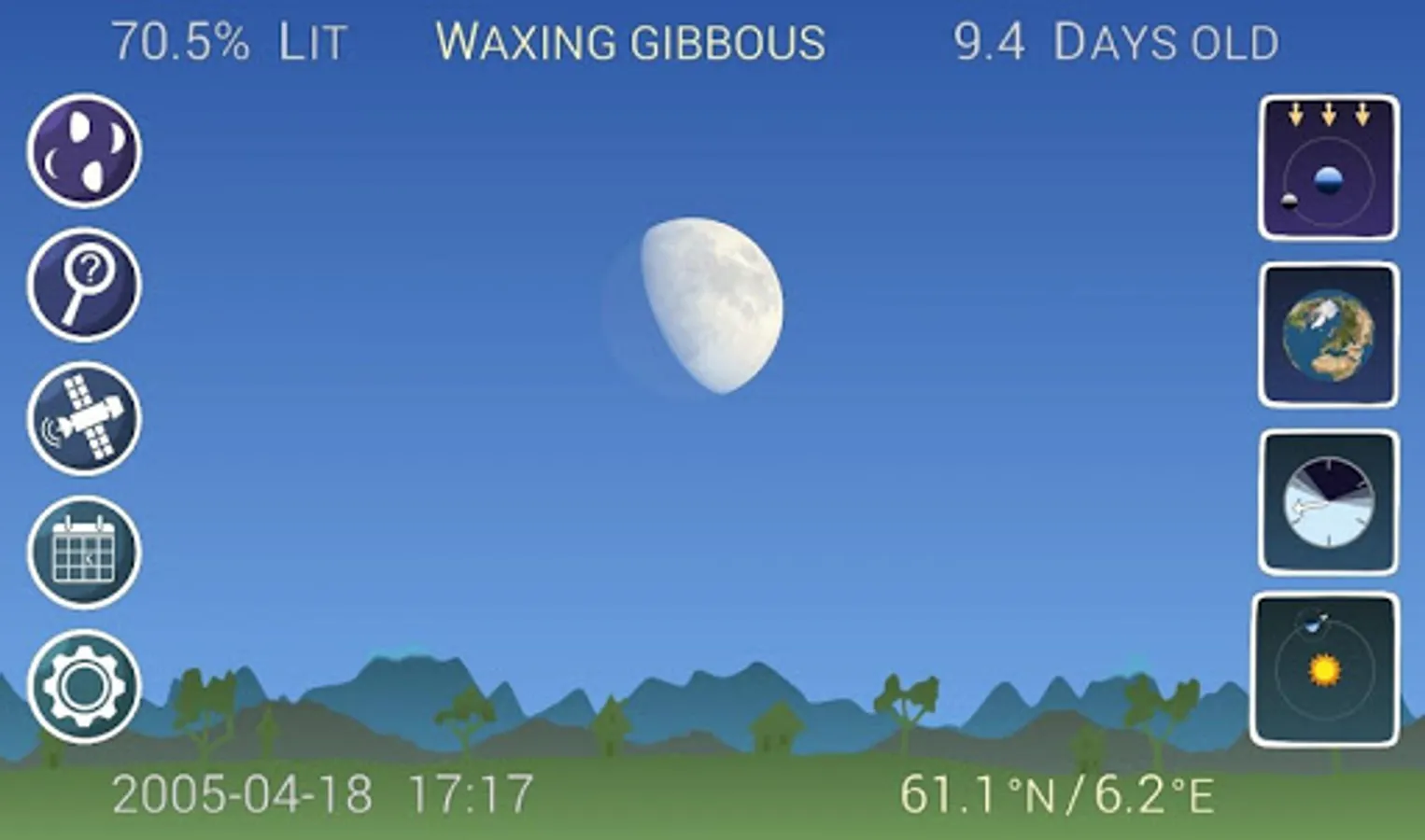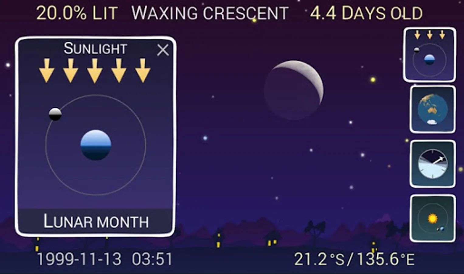 What causes the familiar monthly cycle of lunar phases? What’s a waning gibbous or a waxing crescent Moon? Why does the Moon appear tilted at different angles depending on whether you’re in New York or Sydney? What does the Moon look like at different times from different places on Earth? Try LUNA to find out.