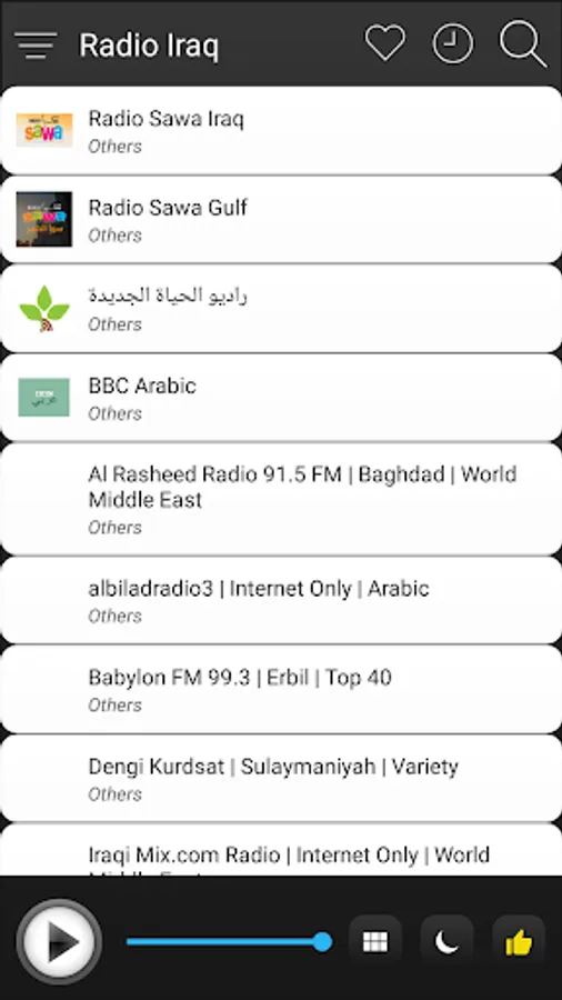 Iraq Radio (راديو و إذاعات العراق) includes the most popular Iraq radio stations all together for faster, easier listening and for free. You can quickly enjoy your favourite Iraq radios by various categories in one click, instant playback and premium quality.