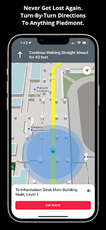 • Locate a department, patient room or amenity inside the hospital with turn-by-turn, guided navigation