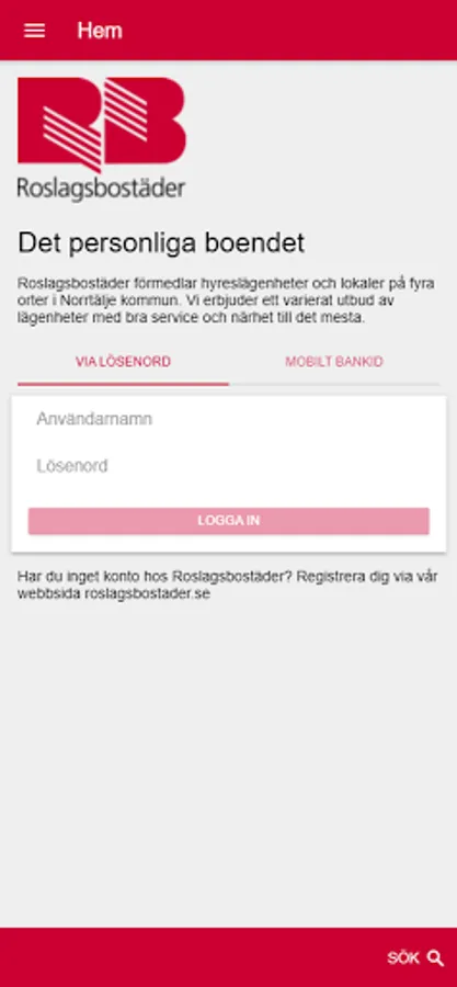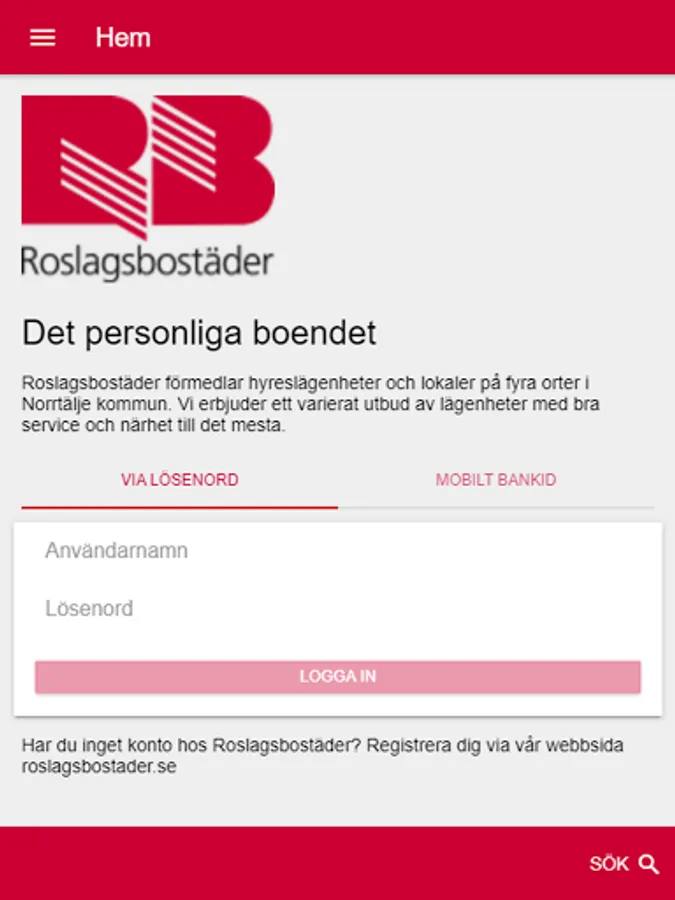 With Roslagsbostäder's home app, you simply search for vacant objects in Norrtälje, Älmsta, Rimbo and Hallstavik. As a tenant you can manage your housing matters via "My pages", put you in a vehicle queue and search for a vehicle site and get news and important messages that affect you and your accommodation.