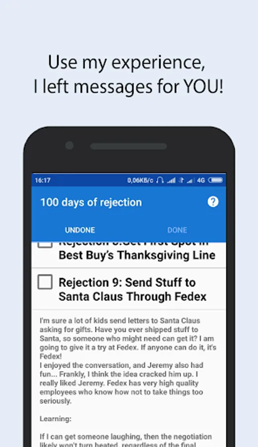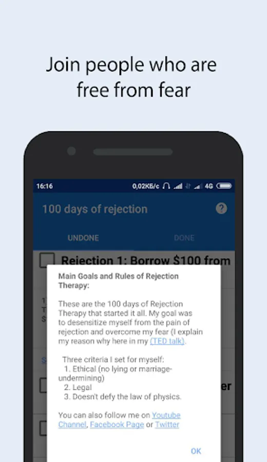 These are the 100 days of Rejection Therapy that started it all. My goal was to desensitize myself from the pain of rejection and overcome my fear (I explain my reason why here in my TED talk).