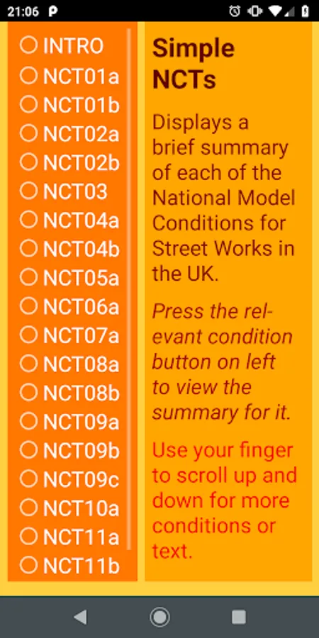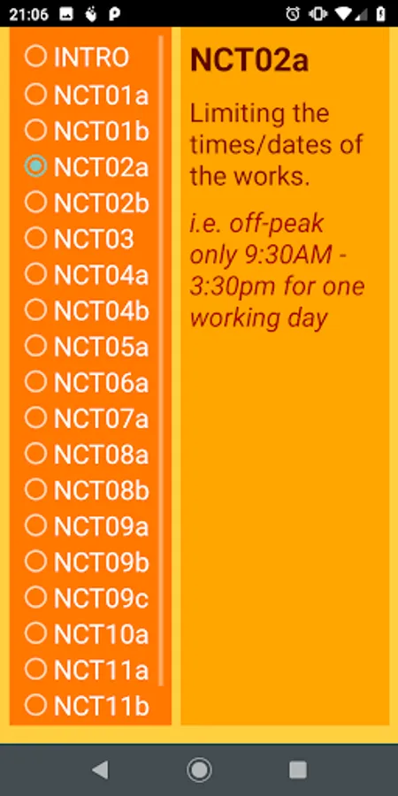 Displays a very brief summary of each of the National Model Conditions (NCTs) which are used in the Electronic Transfer of Notices System (ETON) for electronic Street Works permit applications in the UK.