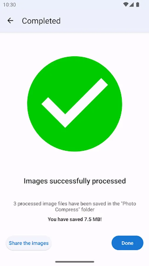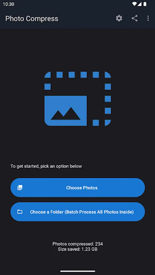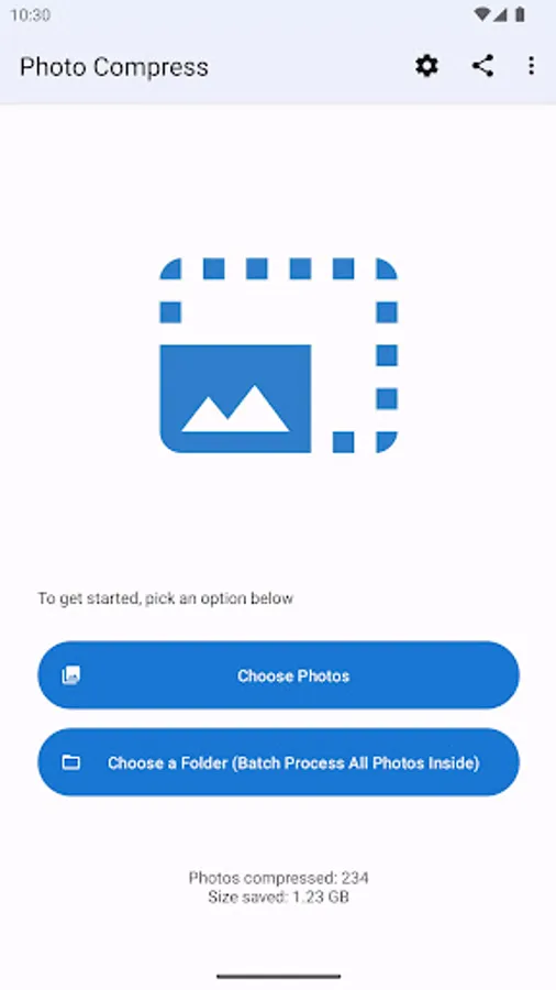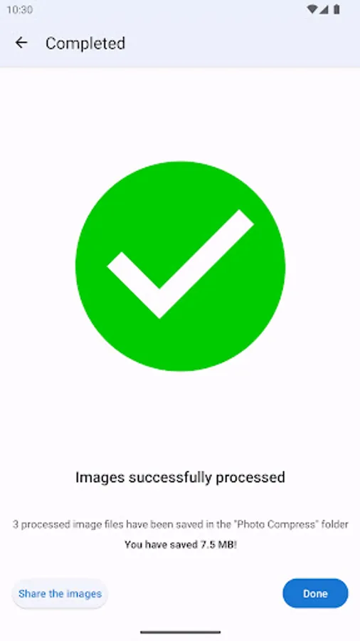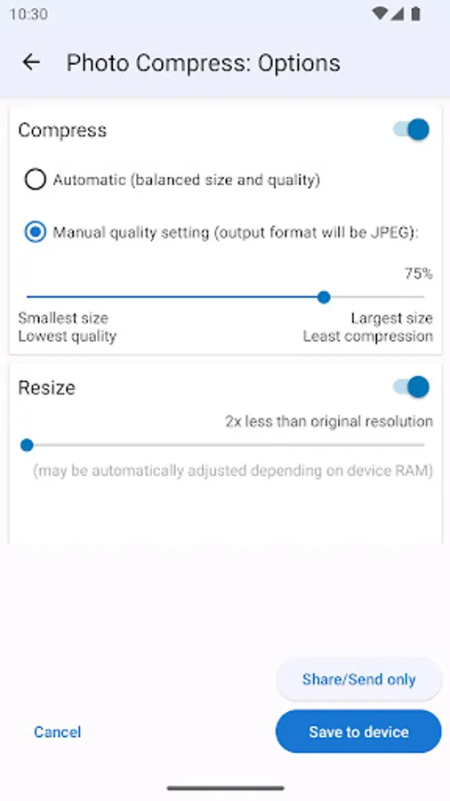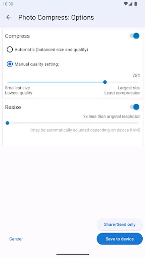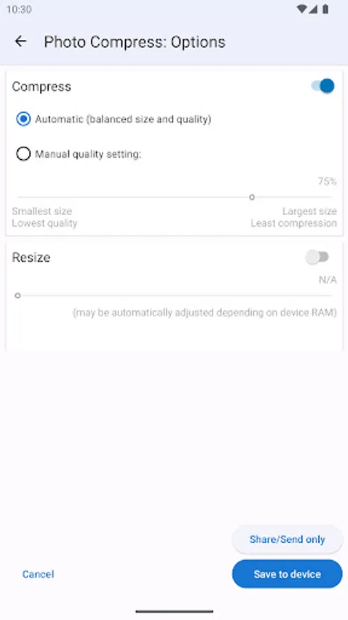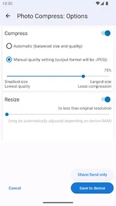 Use either automatic mode, or manual mode that would allow you to configure the quality and size balance you would like your compressed photos/pictures to have.