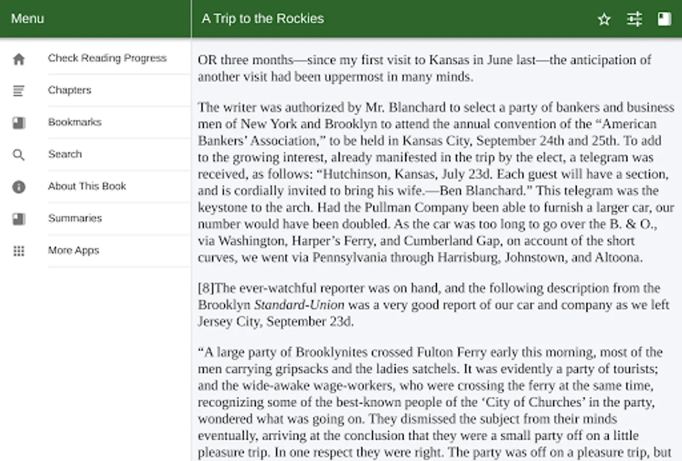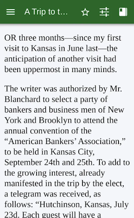 The writer was authorized by Mr. Blanchard to select a party of bankers and business men of New York and Brooklyn to attend the annual convention of the “American Bankers’ Association,” to be held in Kansas City, September 24th and 25th. To add to the growing interest, already manifested in the trip by the elect, a telegram was received, as follows: “Hutchinson, Kansas, July 23d. Each guest will have a section, and is cordially invited to bring his wife.—Ben Blanchard.” This telegram was the keystone to the arch. Had the Pullman Company been able to furnish a larger car, our number would have been doubled. As the car was too long to go over the B. & O., via Washington, Harper’s Ferry, and Cumberland Gap, on account of the short curves, we went via Pennsylvania through Harrisburg, Johnstown, and Altoona.