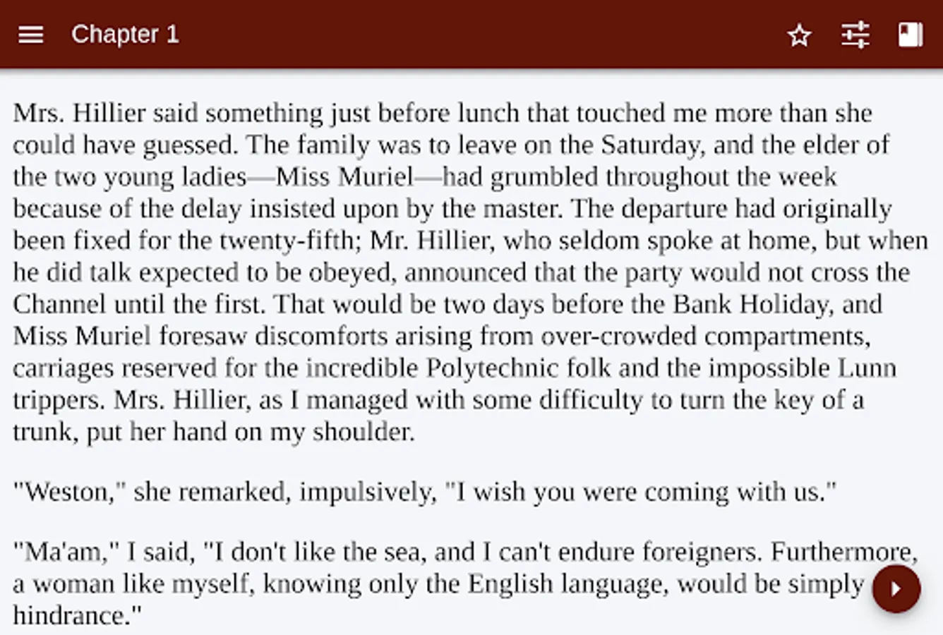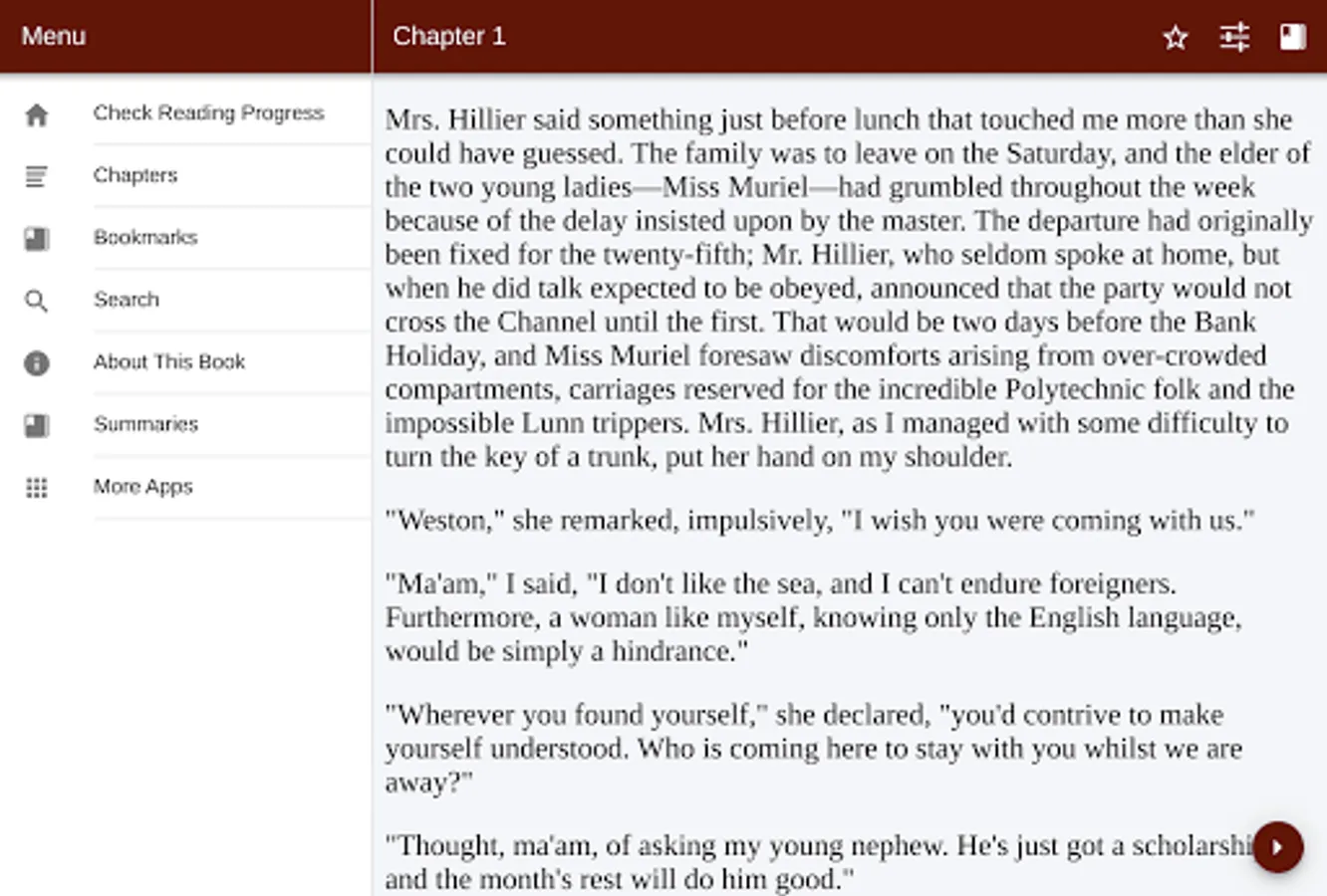 Mrs. Hillier said something just before lunch that touched me more than she could have guessed. The family was to leave on the Saturday, and the elder of the two young ladies - Miss Muriel - had grumbled throughout the week because of the delay insisted upon by the master. The departure had originally been fixed for the twenty-fifth Mr. Hillier, who seldom spoke at home, but when he did talk expected to be obeyed, announced that the party would not cross the Channel until the first. That would be two days before the Bank Holiday, and Miss Muriel foresaw discomforts arising from overcrowded compartments, carriages reserved for the incredible Polytechnic folk and the impossible Lunn trippers. Mrs. Hillier, as I managed with some difficulty to turn the key of a trunk, put her hand on my shoulder.