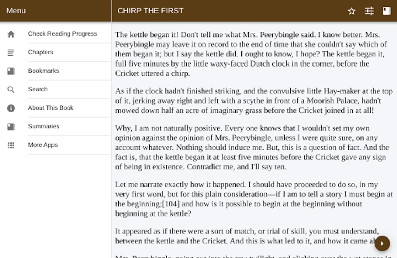 This novel relates about a Cricket which constantly chirps sitting on a hearth in garden and acts like a guardian angel to a family.