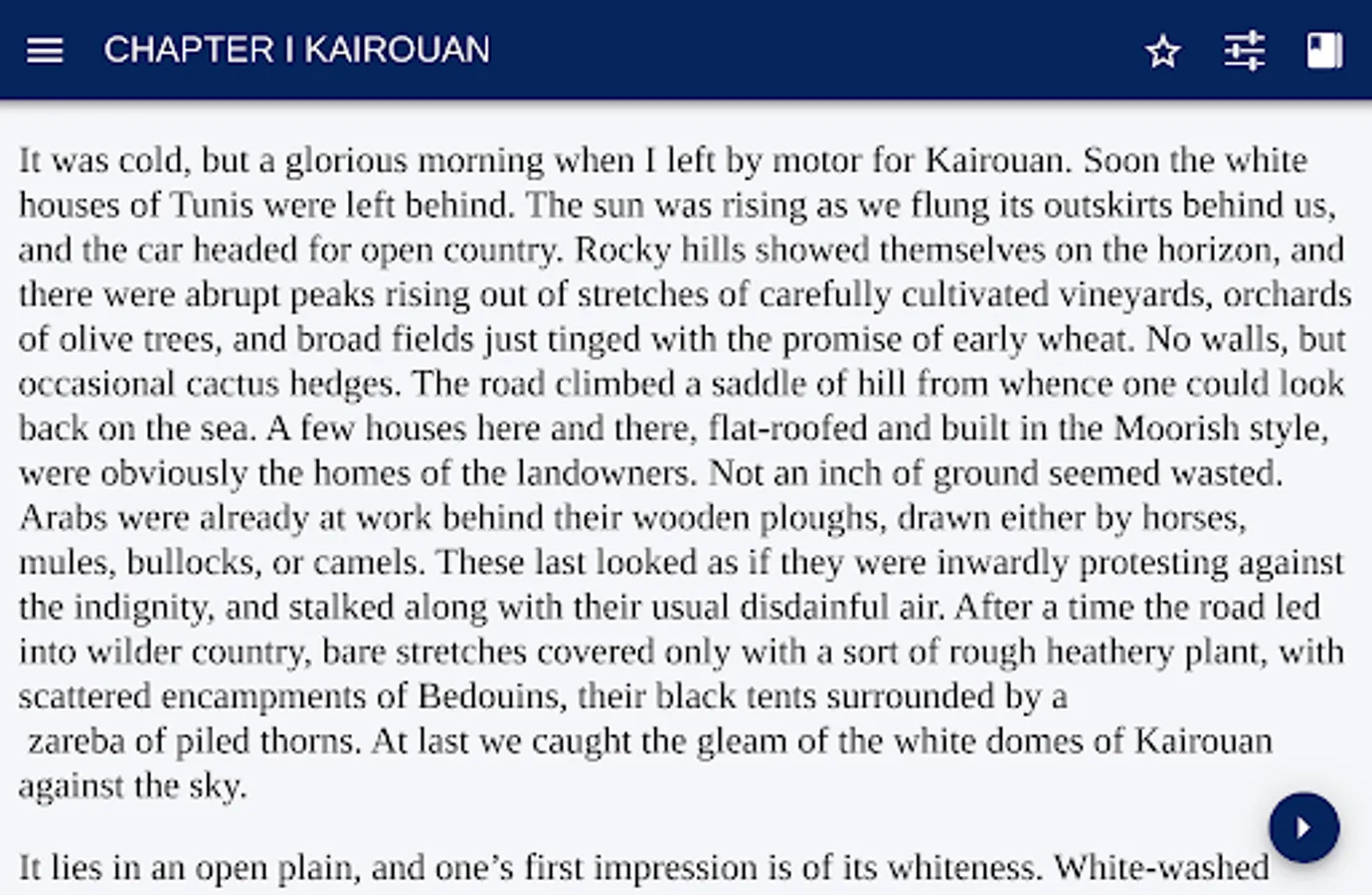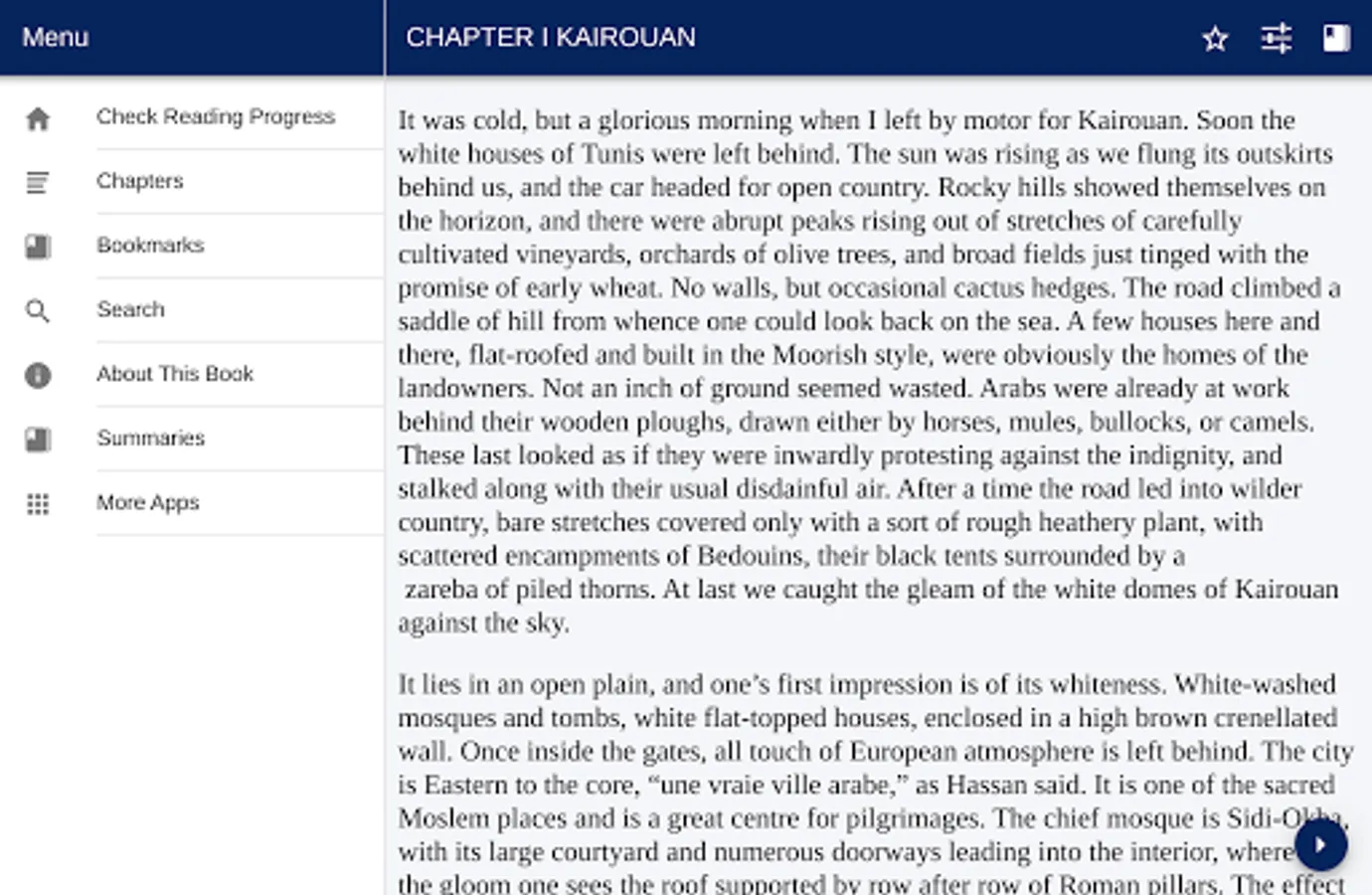 It was cold, but a glorious morning when I left by motor for Kairouan. Soon the white houses of Tunis were left behind. The sun was rising as we flung its outskirts behind us, and the car headed for open country. Rocky hills showed themselves on the horizon, and there were abrupt peaks rising out of stretches of carefully cultivated vineyards, orchards of olive trees, and broad fields just tinged with the promise of early wheat. No walls, but occasional cactus hedges. The road climbed a saddle of hill from whence one could look back on the sea. A few houses here and there, flat-roofed and built in the Moorish style, were obviously the homes of the landowners. Not an inch of ground seemed wasted. Arabs were already at work behind their wooden ploughs, drawn either by horses, mules, bullocks, or camels. These last looked as if they were inwardly protesting against the indignity, and stalked along with their usual disdainful air. After a time the road led into wilder country, bare stretches covered only with a sort of rough heathery plant, with scattered encampments of Bedouins, their black tents surrounded by a