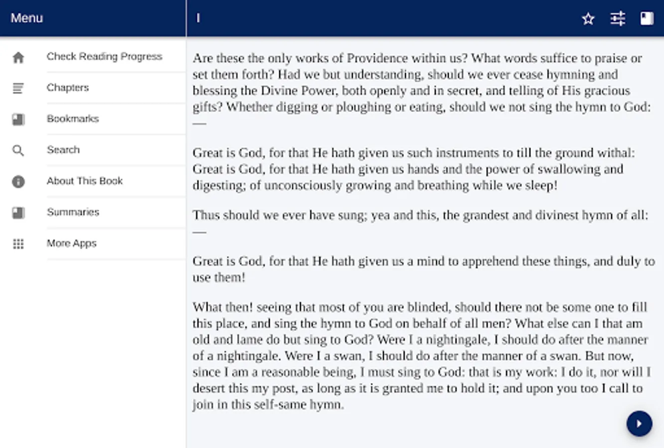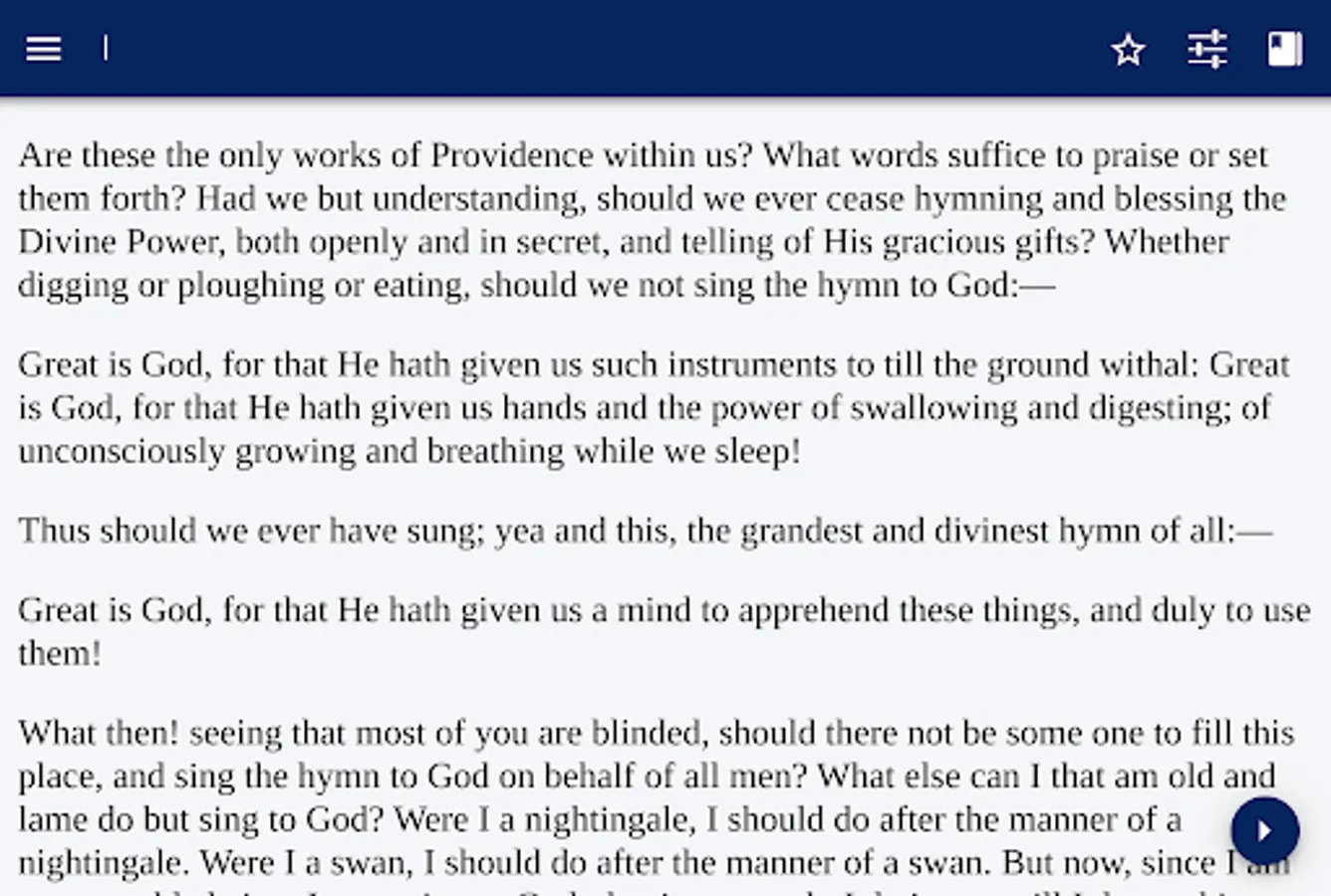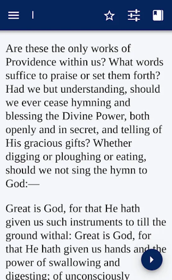 Are these the only works of Providence within us? What words suffice to praise or set them forth? Had we but understanding, should we ever cease hymning and blessing the Divine Power, both openly and in secret, and telling of His gracious gifts? Whether digging or ploughing or eating, should we not sing the hymn to God:—