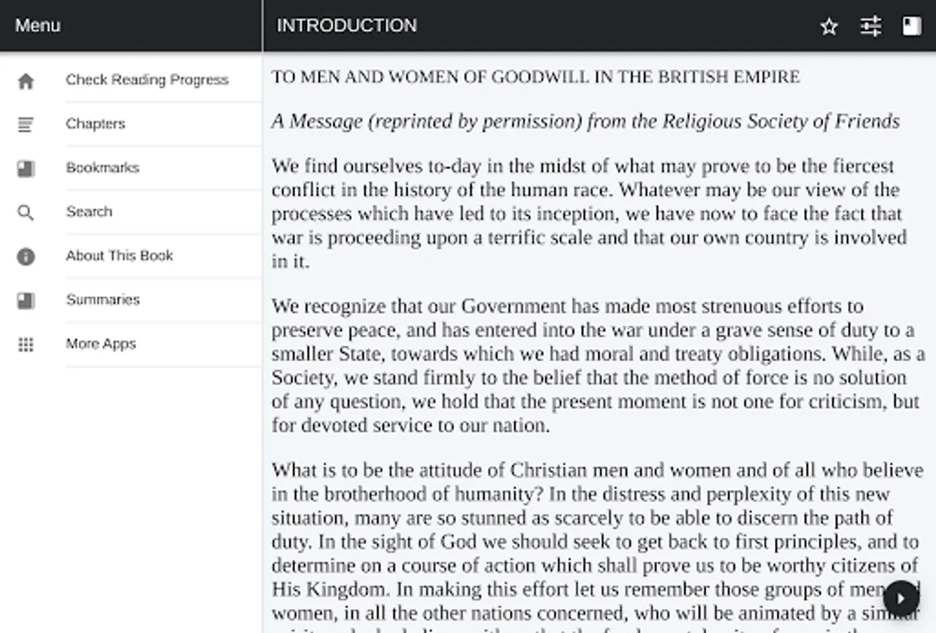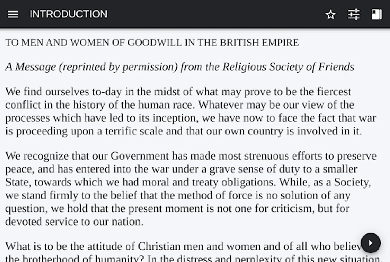 In some respects I should have preferred a Manifesto representing the lofty views of the present Head of another Society of Friends—the Bahai Fraternity. Peace on earth has been the ideal of the Bābīs and Bahais since the Bābs time, and Professor E. G. Browne has perpetuated Baha-'ullah's noble declaration of the imminent setting up of the kingdom of God, based upon universal peace. But there is such a thrilling actuality in the Manifesto of the Disciples of George Fox that I could not help availing myself of Mr. Isaac Sharp's kind permission to me to reprint it. It is indeed an opportune setting forth of the eternal riches, which will commend itself, now as never before, to those who can say, with the Grandfather in Tagore's poem, 'I am a jolly pilgrim to the land of losing everything.' The rulers of this world certainly do not cherish this ideal; but the imminent reconstruction of international relations will have to be founded upon it if we are not to sink back into the gulf of militarism.
