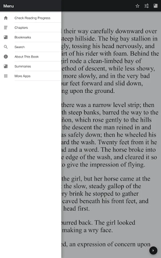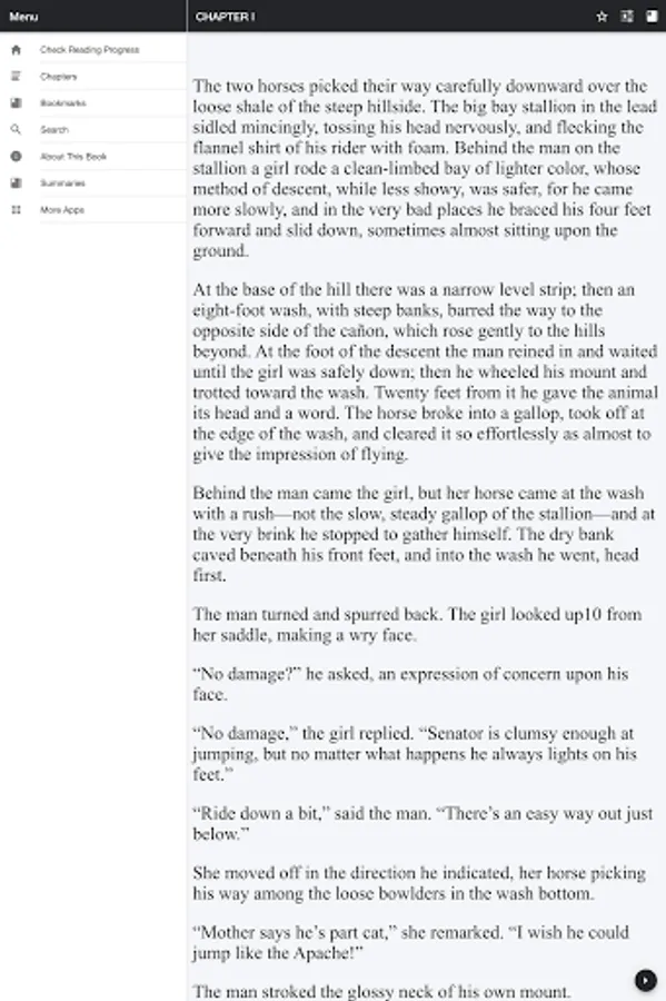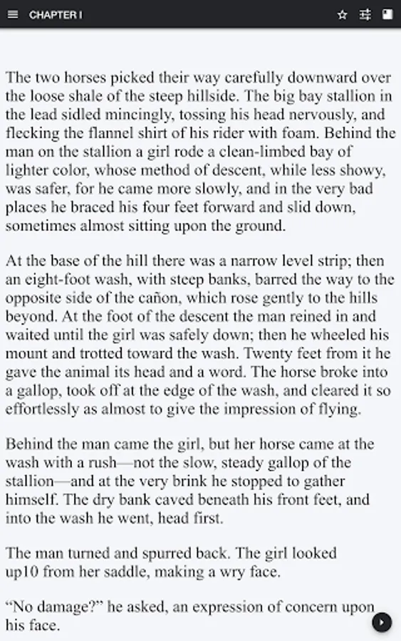 At the base of the hill there was a narrow level strip; then an eight-foot wash, with steep banks, barred the way to the opposite side of the cañon, which rose gently to the hills beyond. At the foot of the descent the man reined in and waited until the girl was safely down; then he wheeled his mount and trotted toward the wash. Twenty feet from it he gave the animal its head and a word. The horse broke into a gallop, took off at the edge of the wash, and cleared it so effortlessly as almost to give the impression of flying.