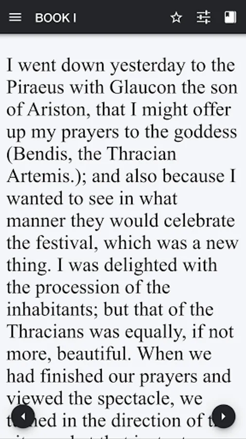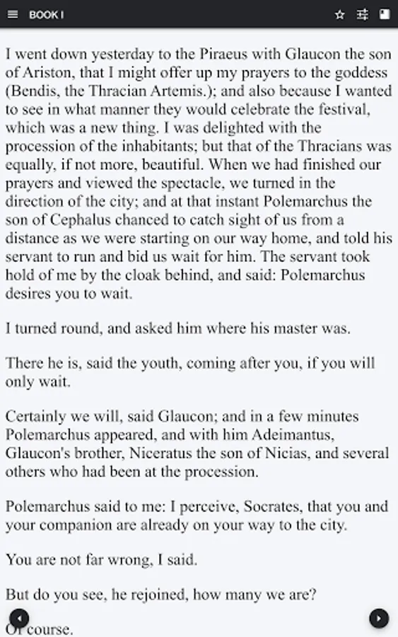 I went down yesterday to the Piraeus with Glaucon the son of Ariston, that I might offer up my prayers to the goddess (Bendis, the Thracian Artemis.); and also because I wanted to see in what manner they would celebrate the festival, which was a new thing. I was delighted with the procession of the inhabitants; but that of the Thracians was equally, if not more, beautiful. When we had finished our prayers and viewed the spectacle, we turned in the direction of the city; and at that instant Polemarchus the son of Cephalus chanced to catch sight of us from a distance as we were starting on our way home, and told his servant to run and bid us wait for him. The servant took hold of me by the cloak behind, and said: Polemarchus desires you to wait.