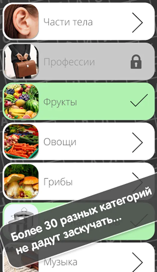 This word game will appeal to all fans of the genre, because with it you will be able to exert a good memory and load your brain to the fullest. The game weight levels, which are distributed to 28 thematic categories!