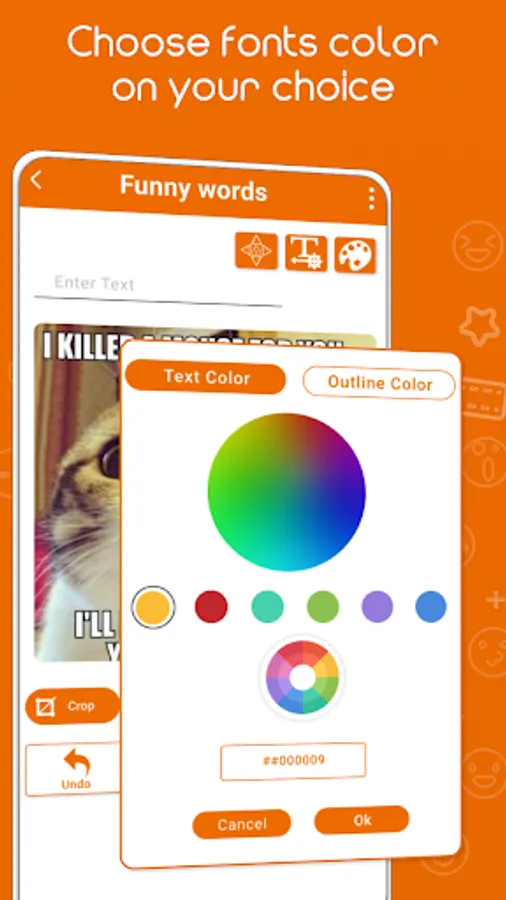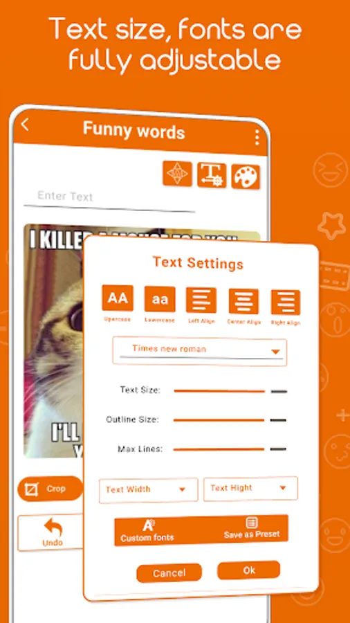 Cover the image with the text. The Meme Maker - Meme Creator app allows you to easily apply various text effects, such as typography, colour, etc. and transfer that text to any location on the image area.