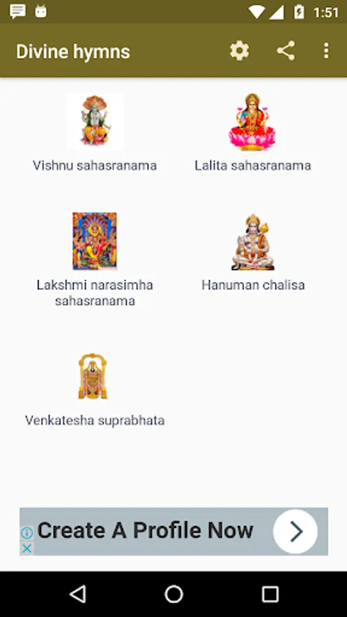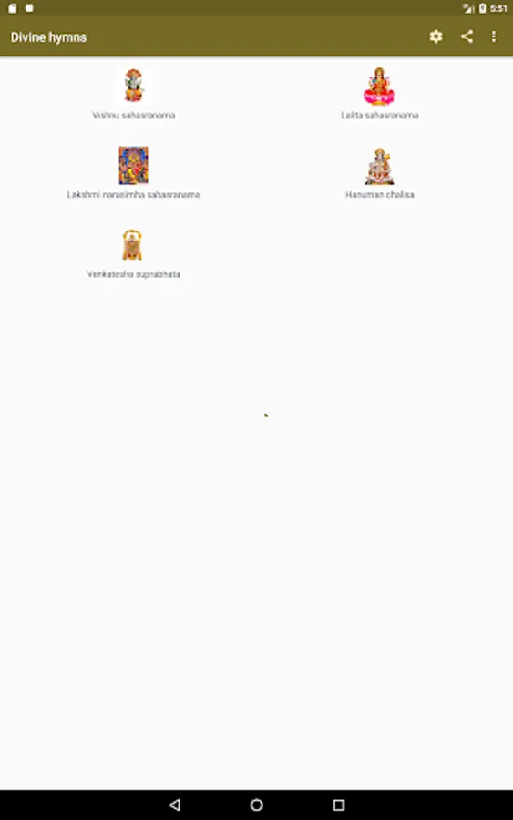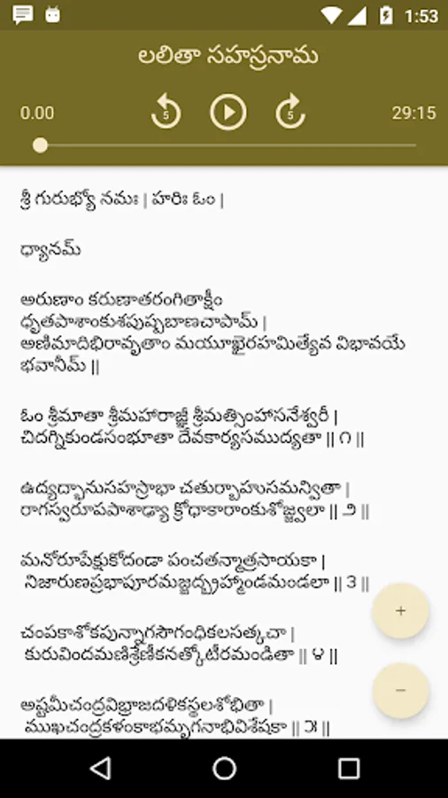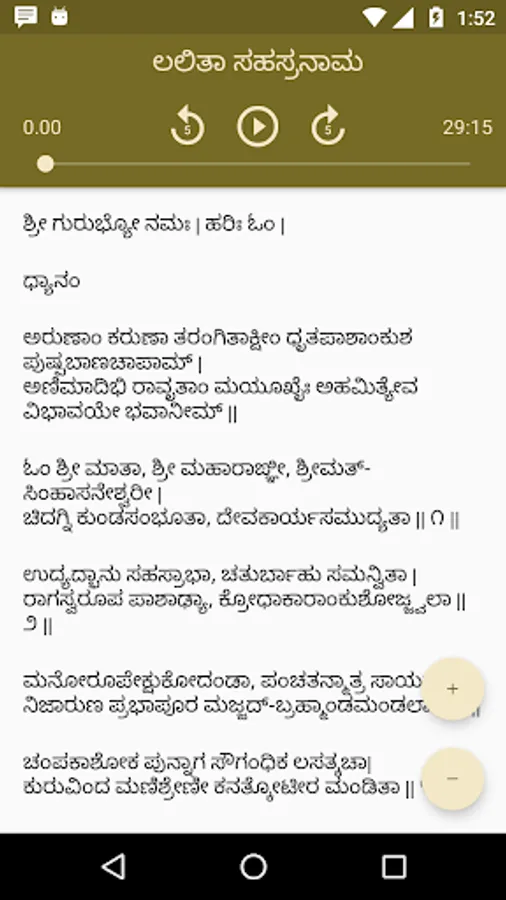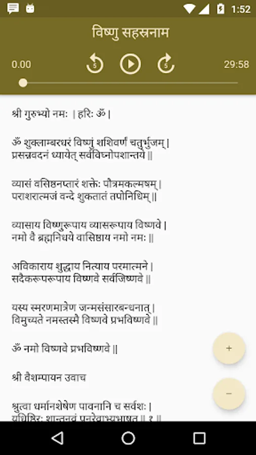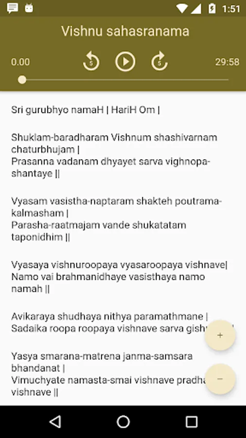 This app contains audio and lyrics of Vishnu Sahasranama, Lalita Sahasranama, Venkatesha Suprabhata, Rudram, Chamakam and Aditya Hridaya.