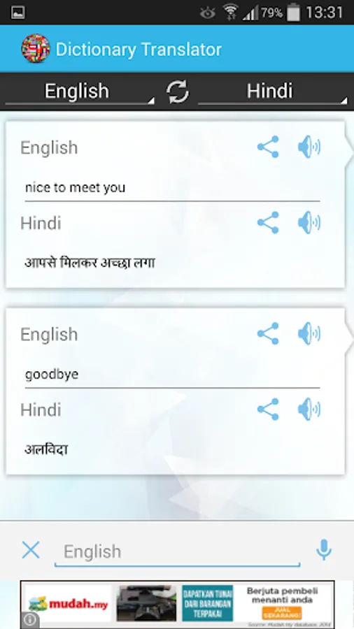 This language converter or language translator app free for download on Android is best to act as interpreter train and learn foreign language. You can have translation from english to any languages including quran translation, have this language translator dictionary to act like free thesaurus or oxford english dictionary.