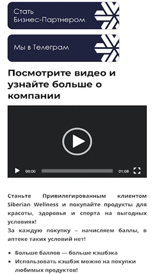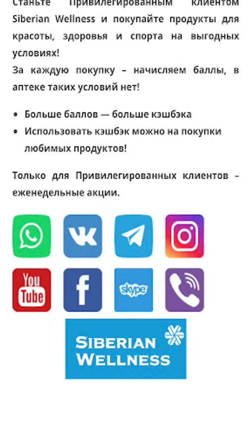 In the Siberian Health application, you can find the current catalog, the registration page for a Client or Business Partner, our telegram channel and instant messengers. You can go to our YouTube channel and see Siberian Wellness product unpackings, real reviews, product reviews and the Siberian Wellness marketing plan.