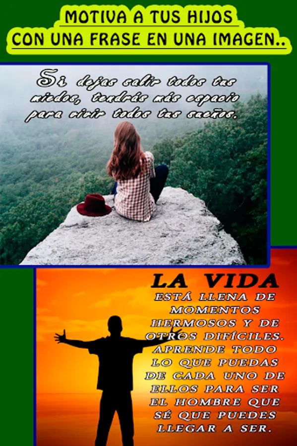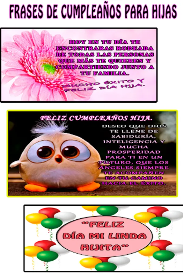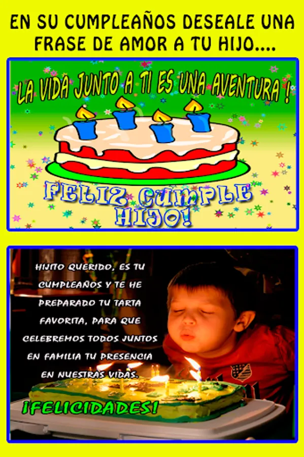 In this app, you will find images for boys and girls on their birthdays, teenage children, older children, motivational messages, and even some reflections left by the parents. Do not forget that you can share them via Facebok, wasap or any other social network. This app is totally free. And we would appreciate it if you could give us a good rating to continue improving for you.
