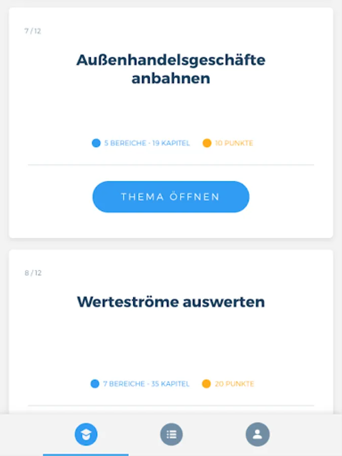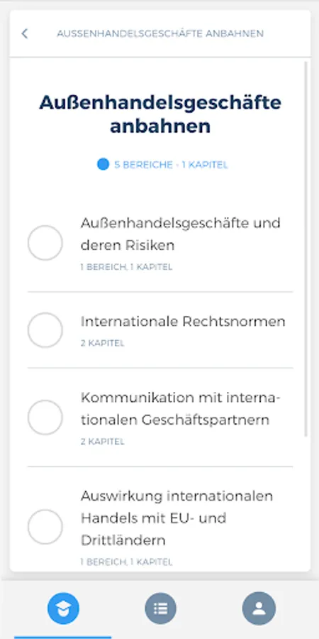 The "Wholesale & Foreign Trade Management" app prepares you comprehensively for your upcoming theoretical examination to become a merchant for wholesale and foreign trade management at the Chamber of Industry and Commerce. The combination of a learning and a testing area thus serves as ideal learning support. In addition, you are always able to view your current learning progress in order to be able to draw conclusions about any knowledge gaps.