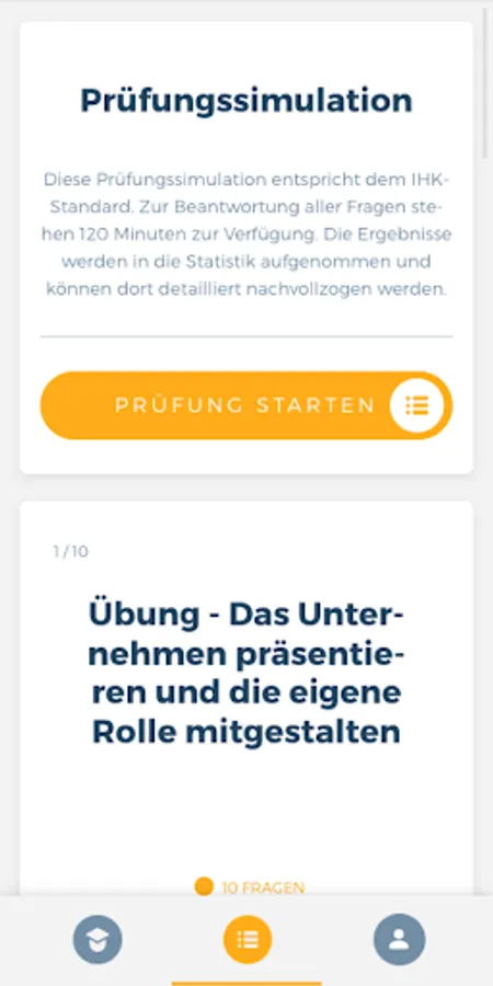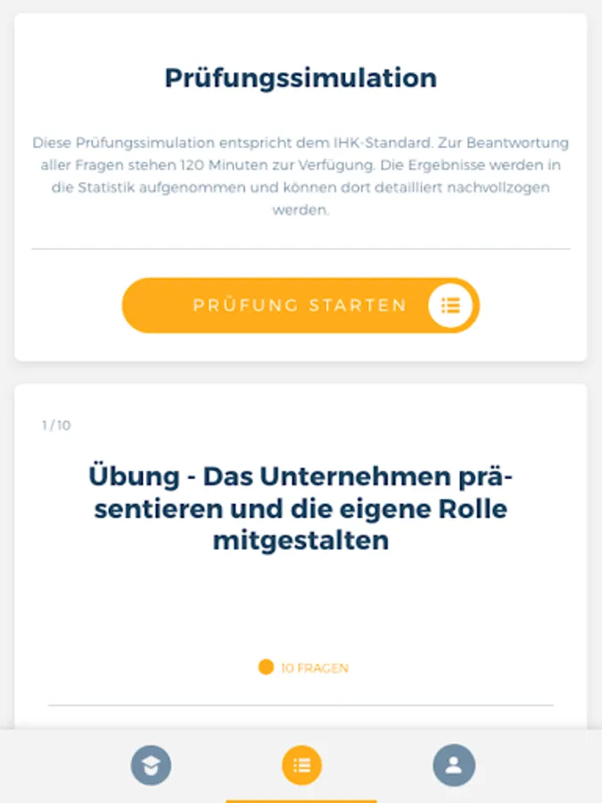With the help of the realistic exam simulation, you have the opportunity to test the knowledge you have previously acquired in the learning area. The framework conditions correspond to the general requirements of the Chamber of Industry and Commerce with regard to the time specifications, answer options, number of questions, etc. After a test run, a pass or fail is immediately shown in the statistics. In addition, a detailed evaluation can be carried out in which each individual question can be traced for "correctness".
