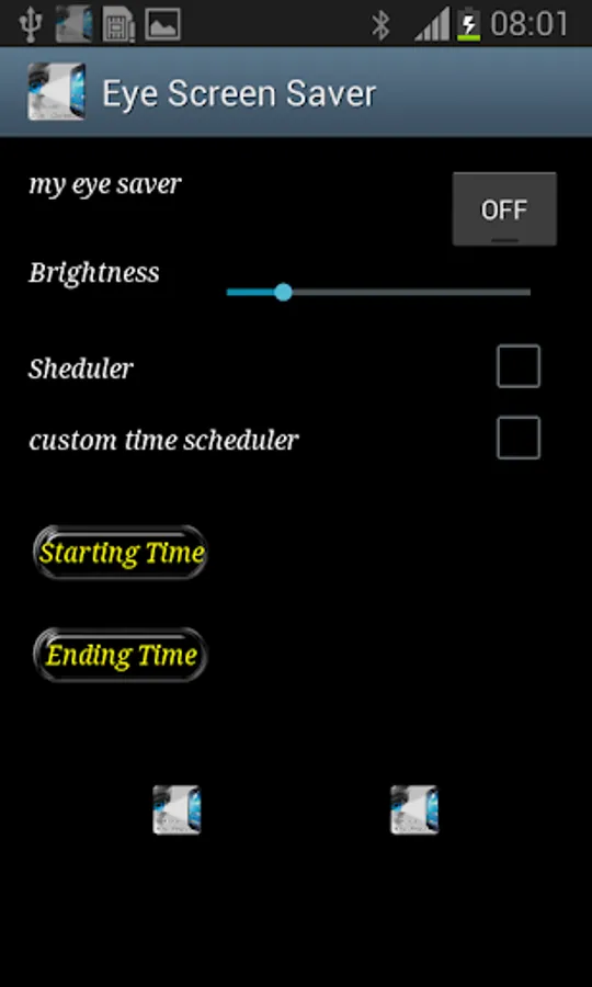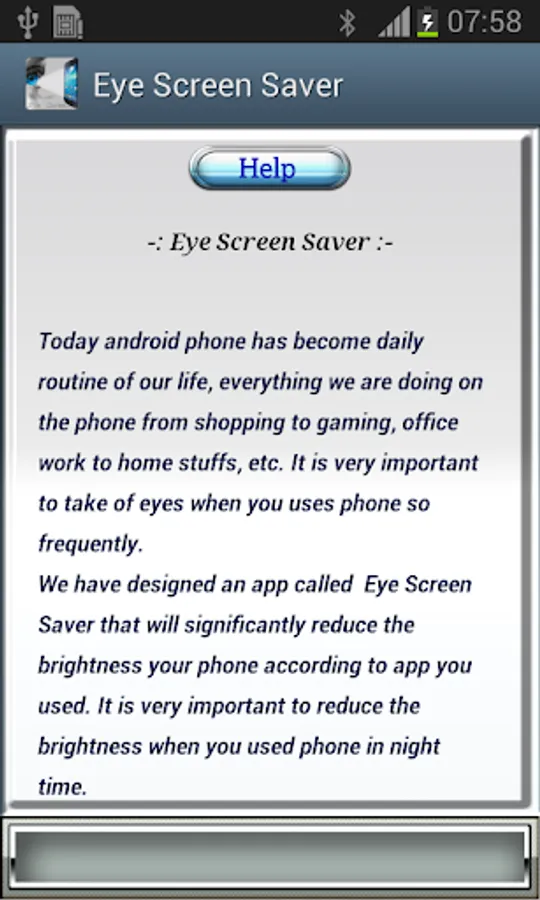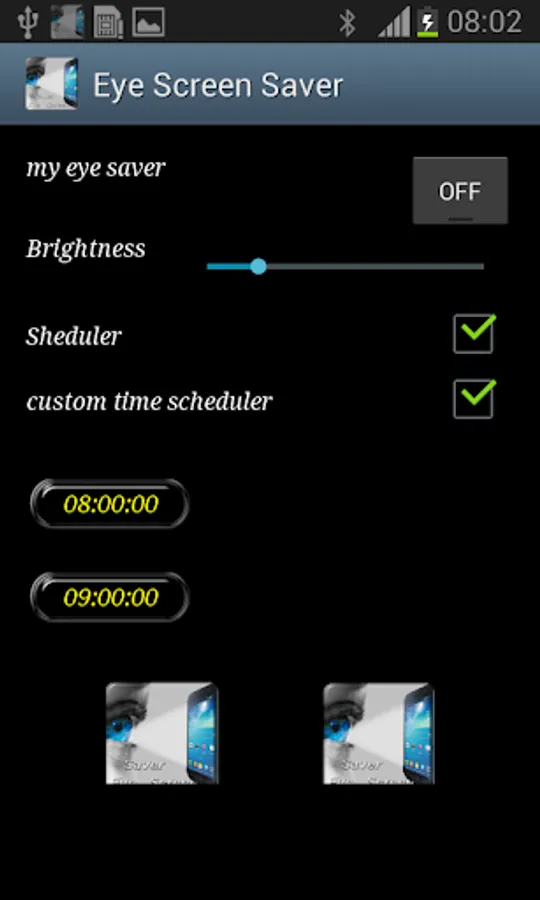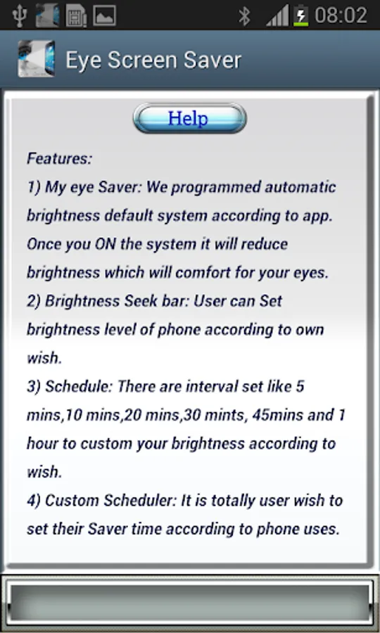 1) Eye Saver: We programmed automatic brightness default system according to app. Once you ON the system it will reduce brightness which will comfort for your eyes.