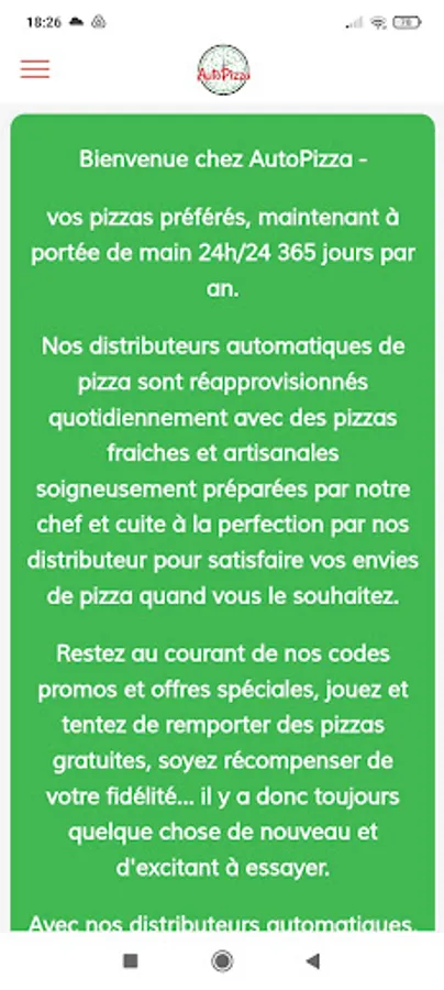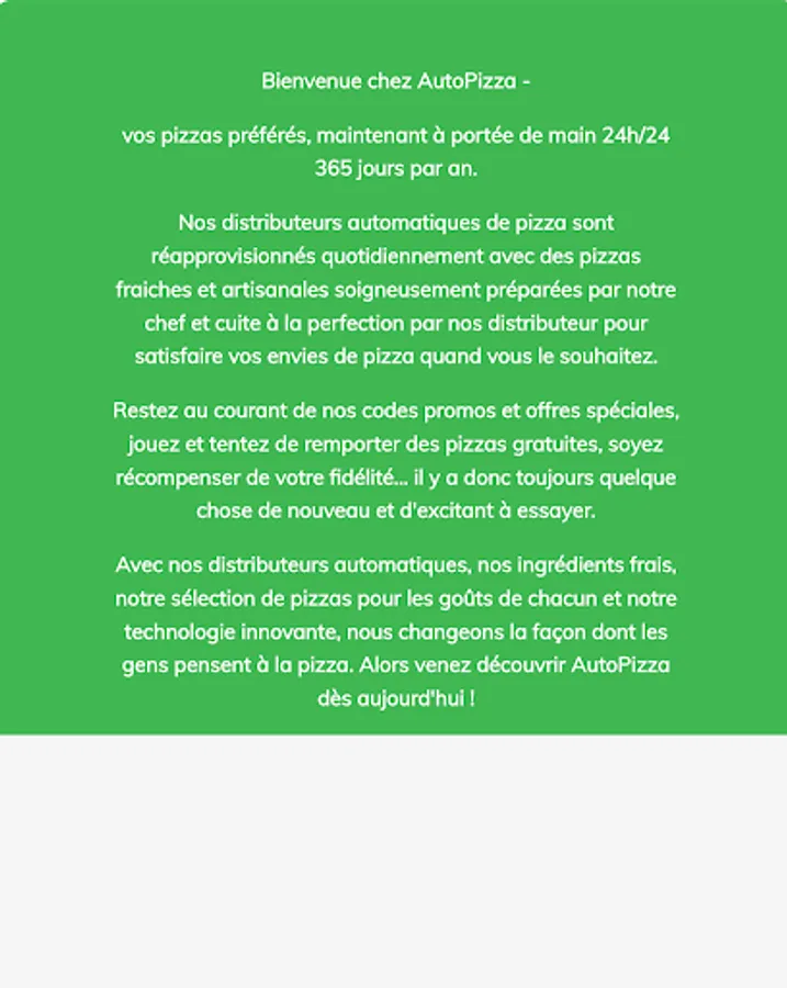 With our vending machines, our fresh ingredients, our selection of pizzas for everyone's tastes and our innovative technology, we are changing the way people think about pizza. So come and discover AutoPizza today!"