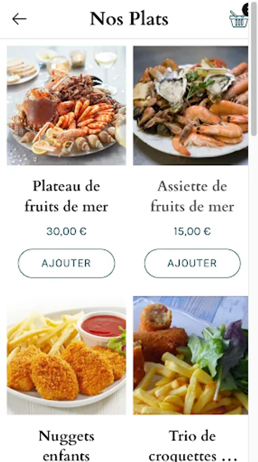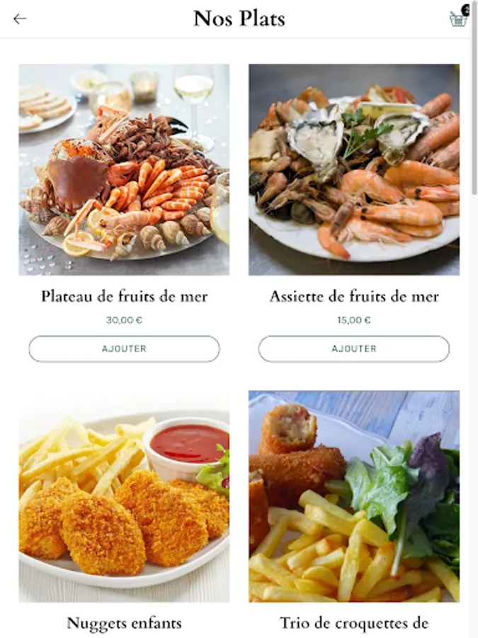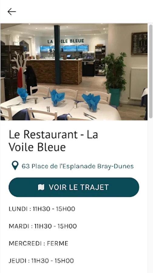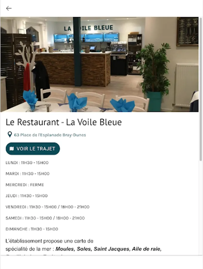 The establishment offers a seafood specialty menu: Mussels, Soles, Scallops, Ray wing, Bouillabaisse, Seafood, etc.