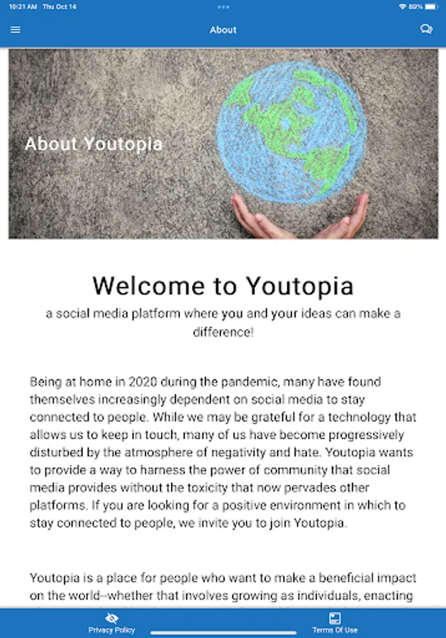 Being at home this last year, many have found themselves increasingly dependent on social media to stay connected to people. While we may be grateful for a technology that allows us to keep in touch, many of us have become progressively disturbed by the atmosphere of negativity and hate. Youtopia wants to provide a way to harness the power of community that social media provides without the toxicity that now pervades other platforms. If you are looking for a positive environment in which to stay connected to people, we invite you to join Youtopia.