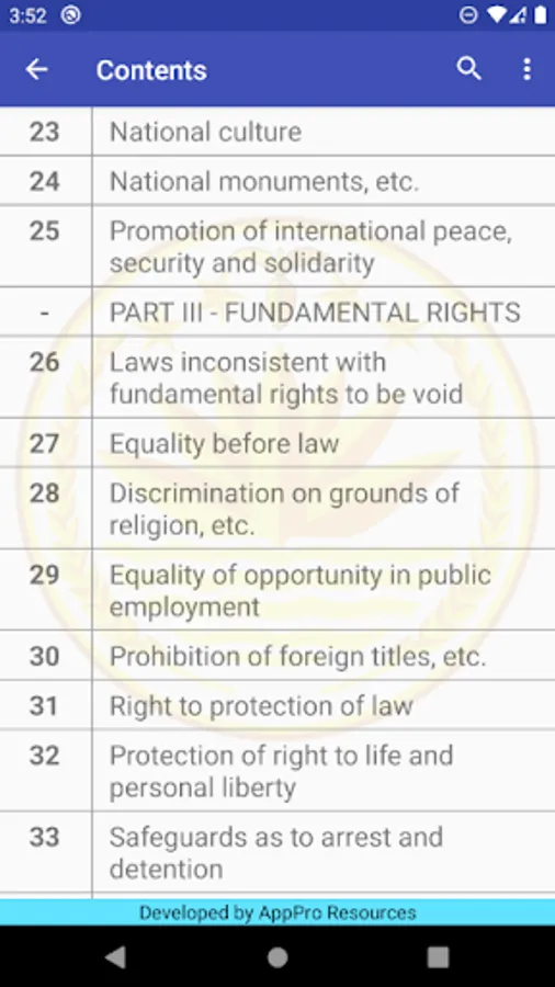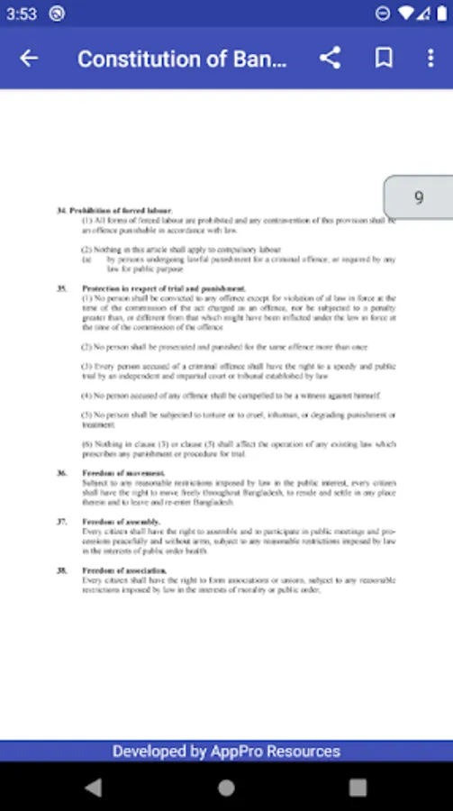 The app contains the Constitution of the People's Republic of Bangladesh in English. Users can browse through the article list and use that to immediately get to the specific article in the Constitution. The document can be zoomed in and out for easier viewing. Users can also take advantage of the share feature to instantly share contents of the screen with friends and family via messaging/email apps. All such contents are also saved on the user's device.