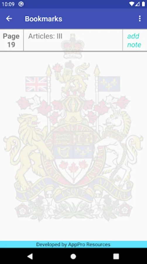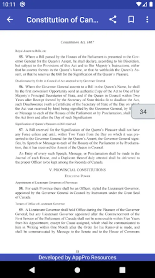 The app contains the Constitution of Canada. Users can browse through the article list and use that to immediately get to the specific article in the Constitution. The document can be zoomed in and out for easier viewing. Users can also take advantage of the share feature to instantly share contents of the screen with friends and family via messaging/email apps. All such contents are also saved on the user's device.
